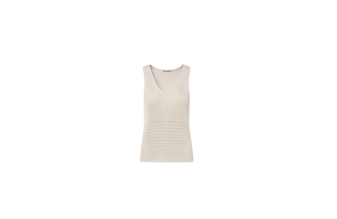 Beaumont Aria top BC81731241. Dit rechtvallend model is voorzien van een v-hals en is mouwloos. Deze beige top is uitgevoerd in een ajour gehaakte kwaliteit en is afgewerkt met een lurexdraad.