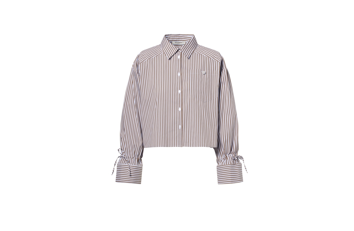 Beaumont blouse Bel BC44421261. Dit wijdvallend cropped model is voorzien van een kraag en heeft lange mouwen bewerkt met strikjes aan de onderzijde. Deze bruine/witte/blauwe blouse van Beaumont sluit door middel van knopen en is allover bewerkt met strepen. Dit model is afgewerkt met een borstzak met een sierlijke knoop.