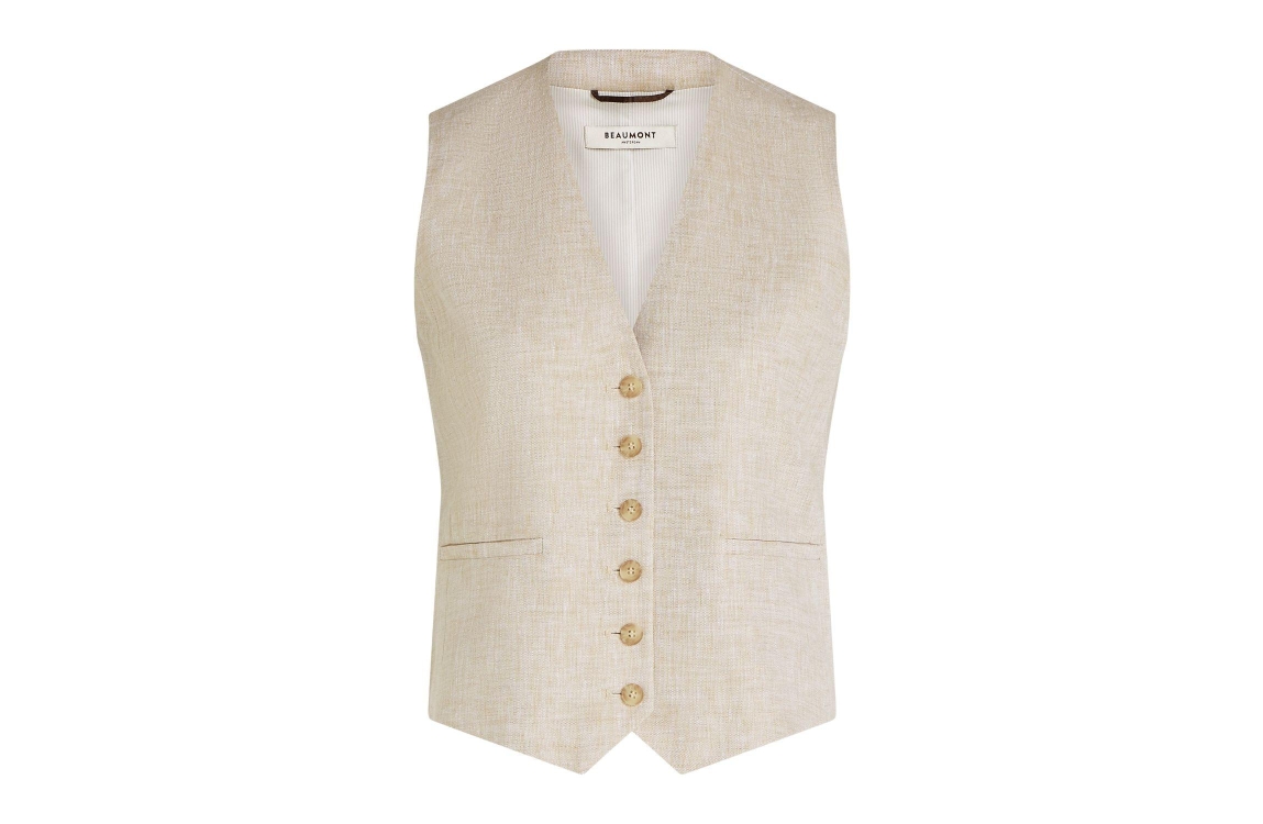 Beaumont BERLIN Gilet 2790 soft camel melange. Dit licht getailleerde model heeft een V-hals en is mouwloos. Deze beige gilet van Beaumont sluit door middel van knopen. Het model is gedetailleerd met een gesp op de rug en voorzien van twee paspelzakken.