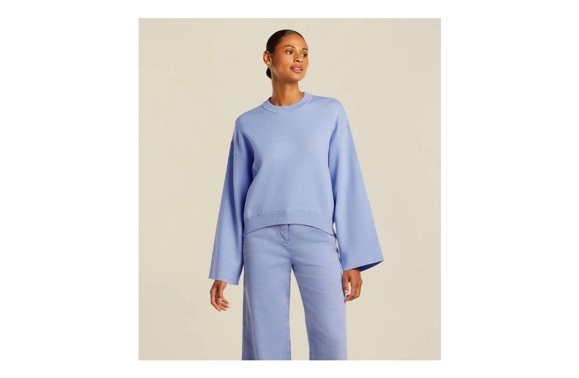 Beaumont CHITA Pullover 5470 heavenly blue. Dit soepelvallende model heeft een ronde hals en lange wijd uitlopende mouwen. Deze blauwe pullover van Beaumont is afgewerkt met boorden.