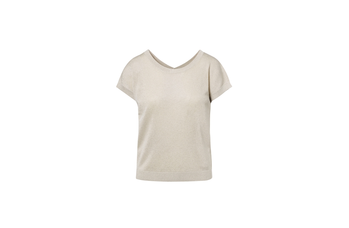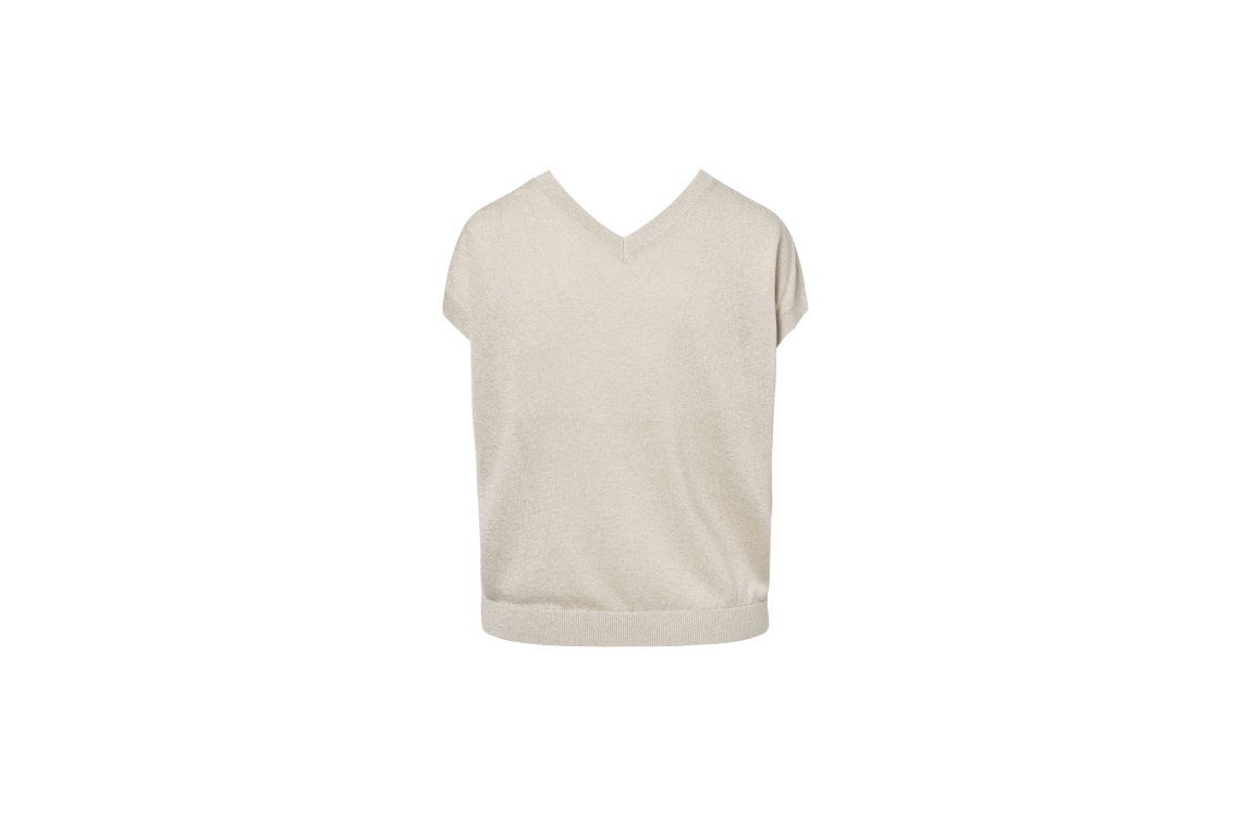 Beaumont DION pullover BC81730261 1150. Dit rechtvallende model is aan twee zijden draagbaar, met aan de ene zijde een ronde hals en aan de andere zijde een V-hals. Deze kitkleurige pullover van Beaumont heeft korte mouwen en is uitgevoerd met glitterlurex.