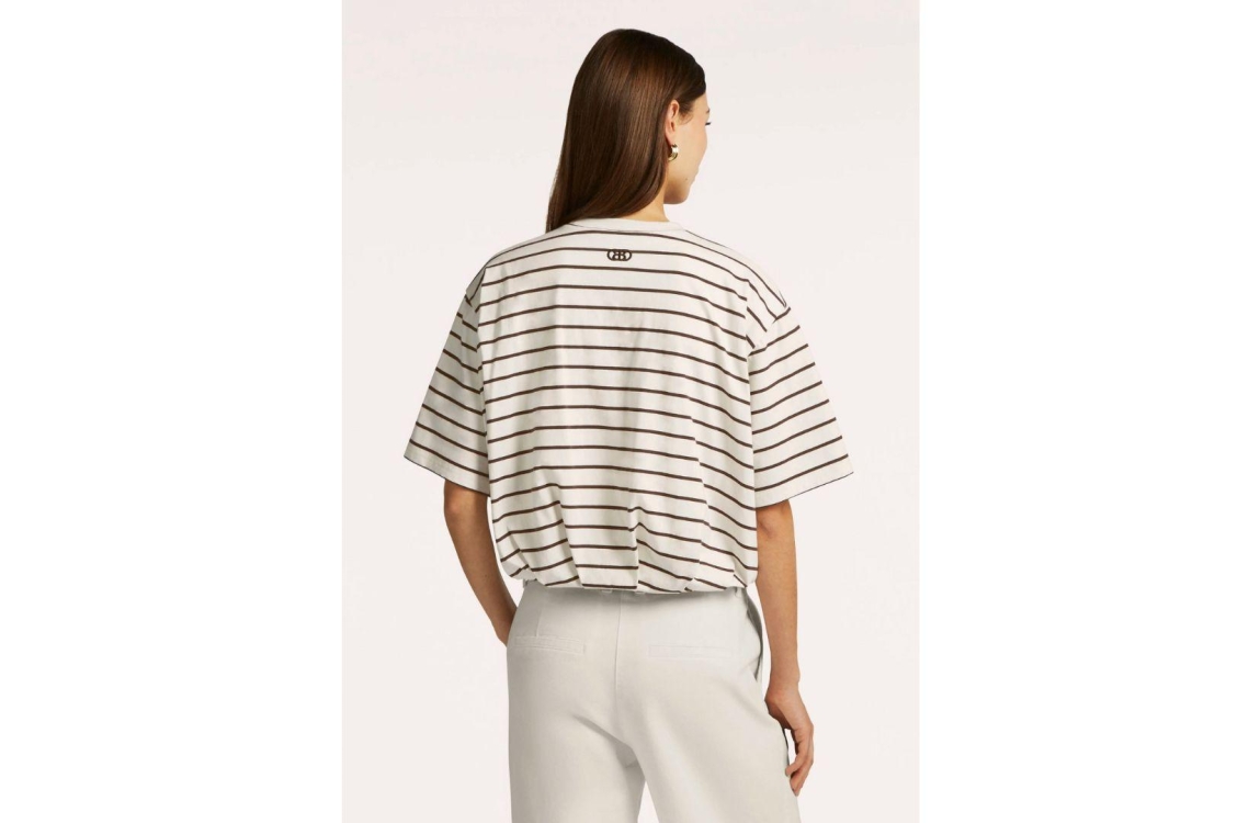 Beaumont top Dolores BC59720261. Dit cropped model is voorzien van een ronde hals en heeft korte mouwen. Deze crème kleurige top is bewerkt met bruine strepen.