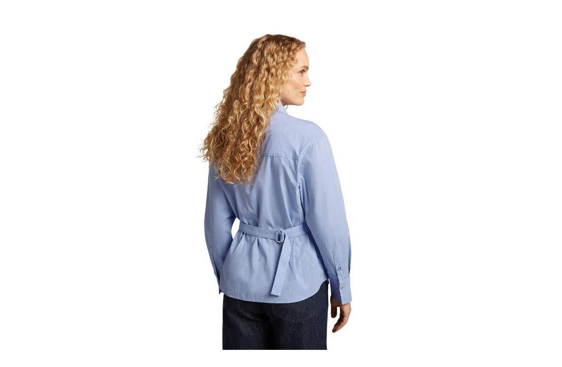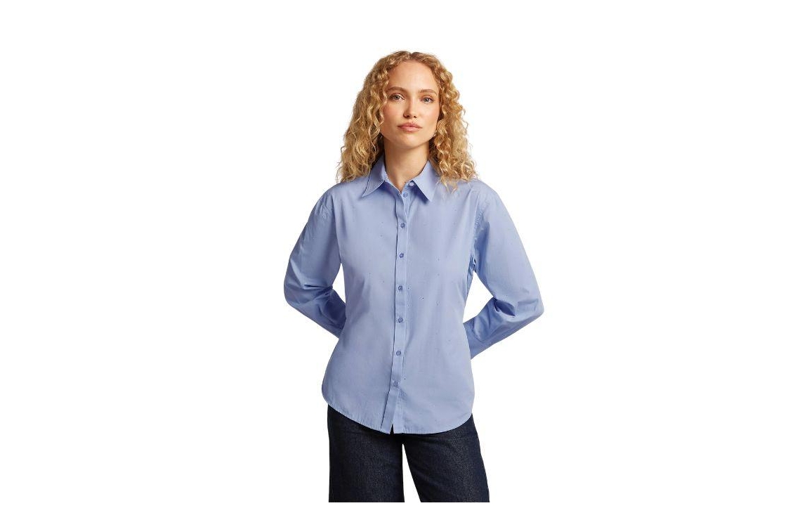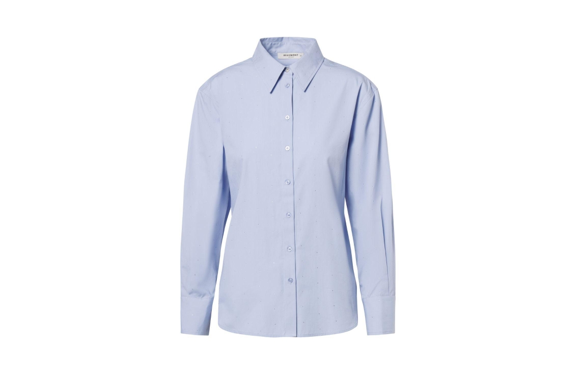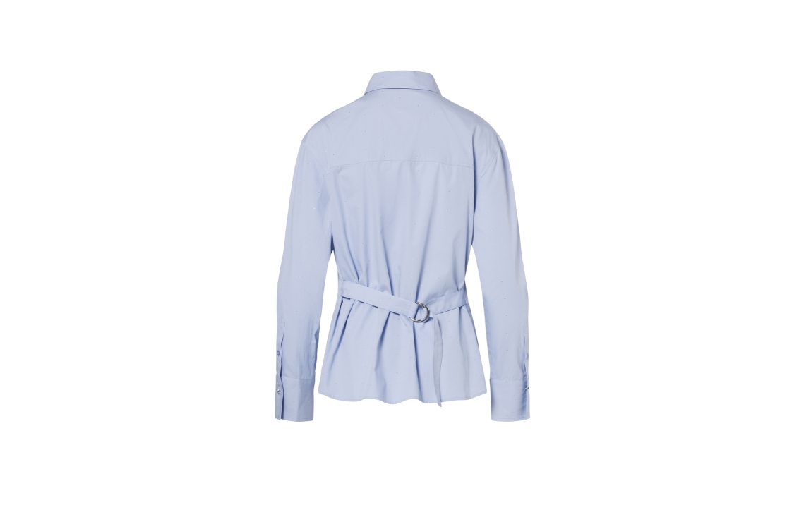 Beaumont LEYLA Blouse 5470 heavenly blue. Dit rechtvallende model heeft een kraag, lange mouwen en sluit door middel van knopen. Deze blauwe blouse van Beaumont heeft een riem in hetzelfde materiaal in de taille met D-ringen aan de achterzijde. Dit model is all-over bewerkt met strass-steentjes.