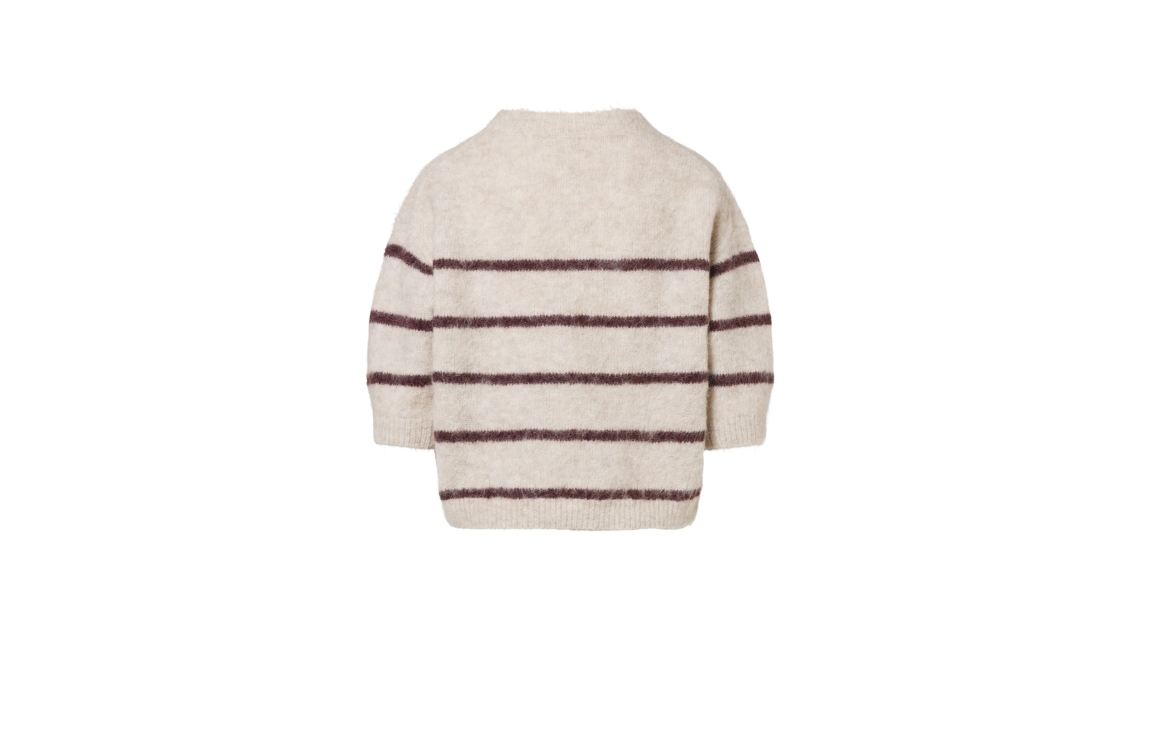 Beaumont PENNELOPE pullover BC85731253. Dit rechtvallend model is voorzien van een ronde hals en heeft driekwart mouwen. Deze beige pullover van Beaumont is bewerkt met donkerrode strepen.