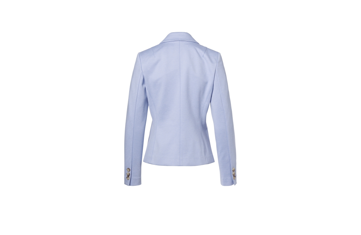 Beaumont blazer Petit 5471. Dit rechtvallende model is voorzien van een kraag en heeft lange mouwen afgewerkt met een split en knopen. Deze lichtblauwe blazer van Beaumont sluit aan de voorzijde door middel van een knoop en is voorzien van twee decoratieve paspelzakken.