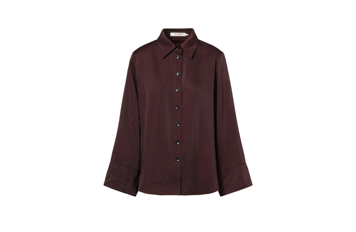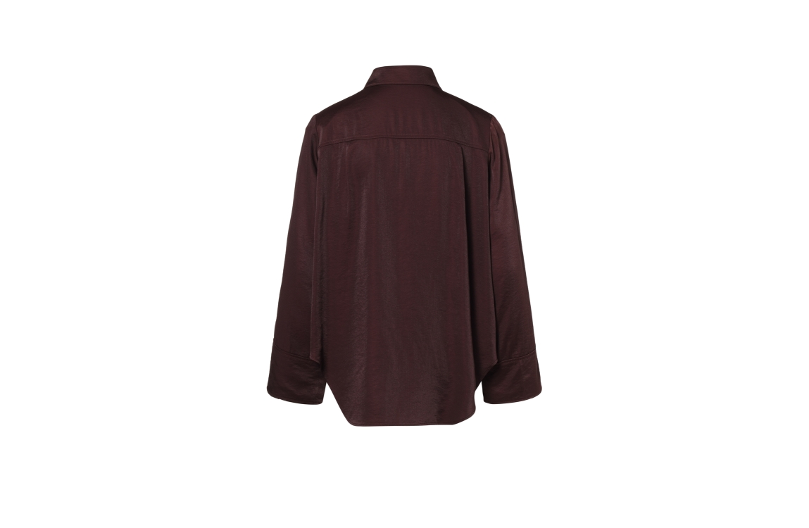 Beaumont SEM Blouse 4840 burgundy. Dit soepelvallende model heeft een kraag, lange mouwen en sluit door middel van knopen. Deze bordeaux rode blouse van Beaumont is uitgevoerd in een satin-look materiaal.