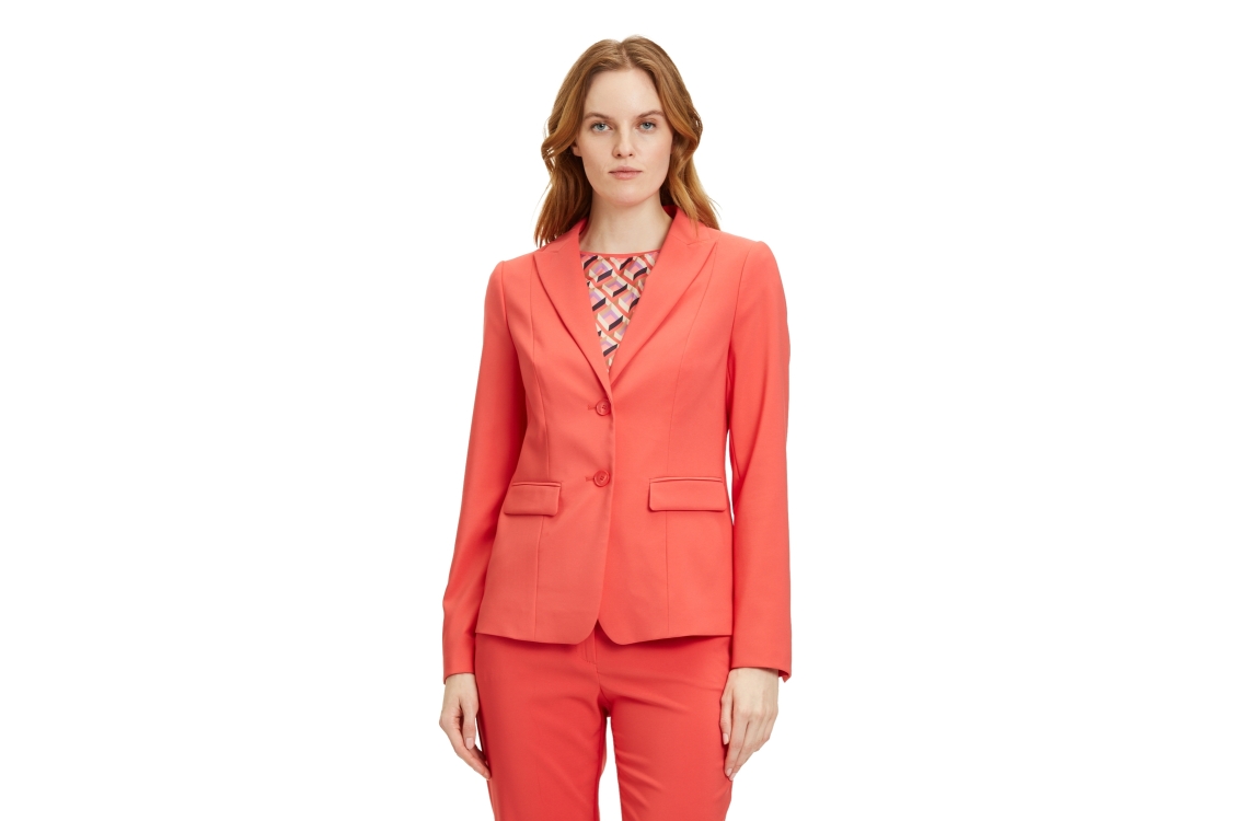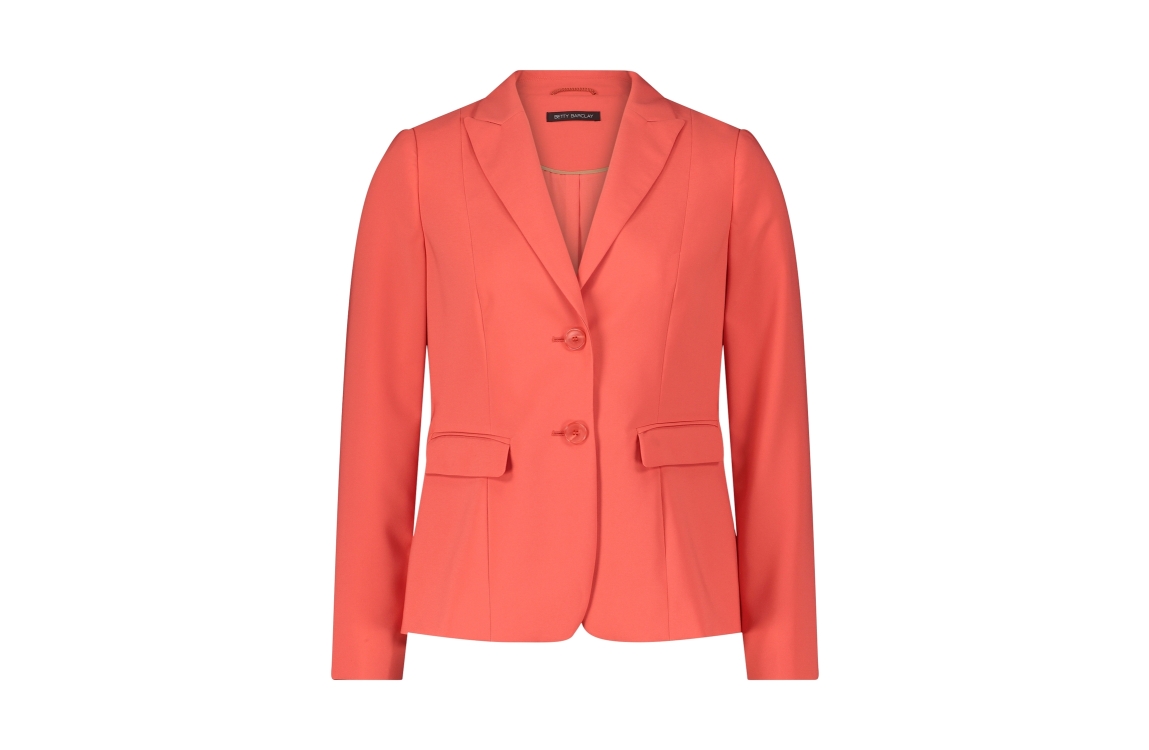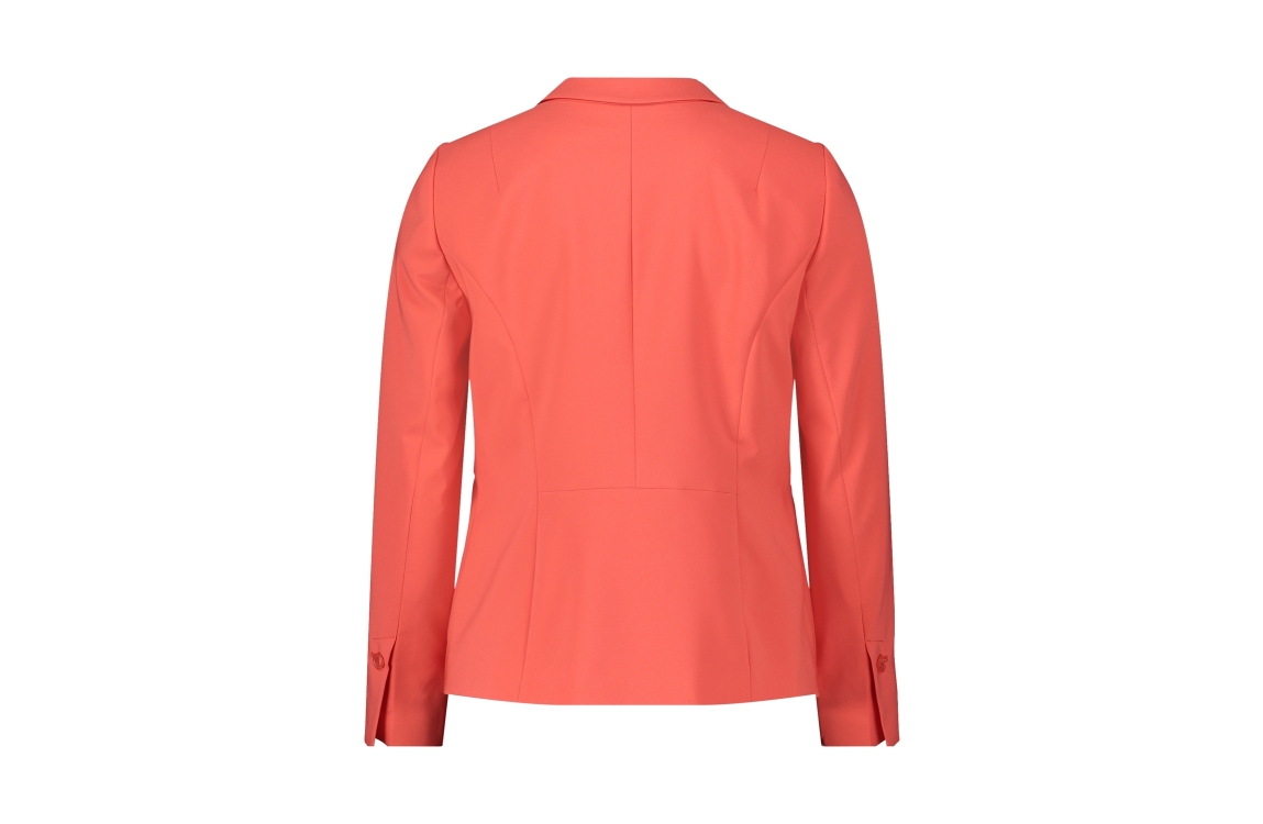 Betty Barclay blazer 42001080-8345. Dit rechtvallend model is voorzien van een reverskraag, lange mouwen en sluit door middel van knopen. Deze koraalkleurige blazer van Betty Barclay heeft paspelzakken met klepjes op de voorzijde.