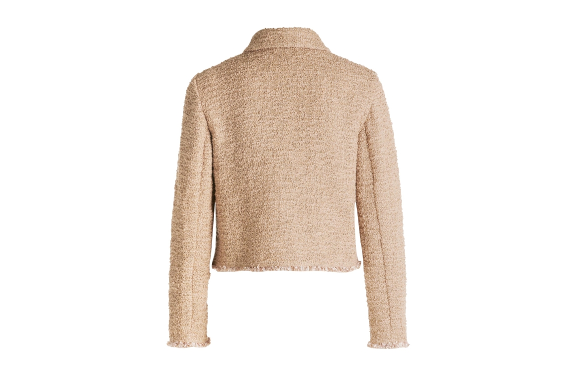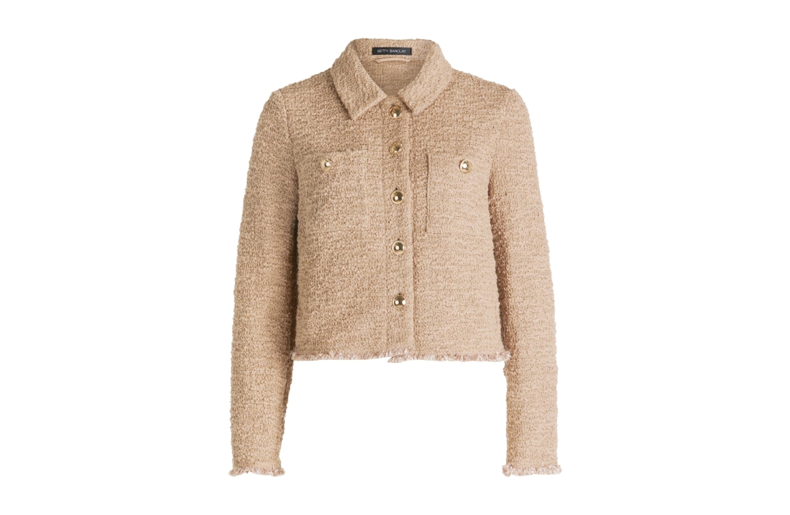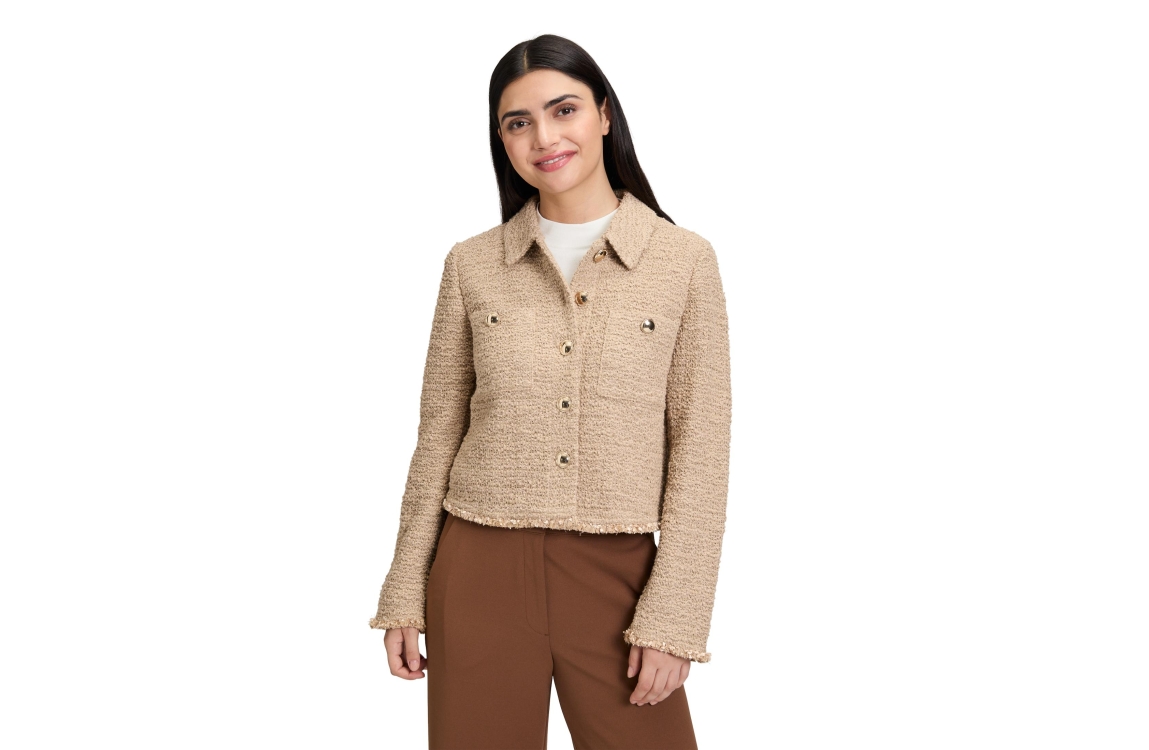 Betty Barclay jasje 4521/1135/7234. Dit rechtvallend model heeft een kraag en lange mouwen. Deze beige boucle blazer van Betty Barclay heeft opgestikte zakken en leuke ruffles aan de boorden en sluit door middel van goudkleurige knopen aan de voorzijde.