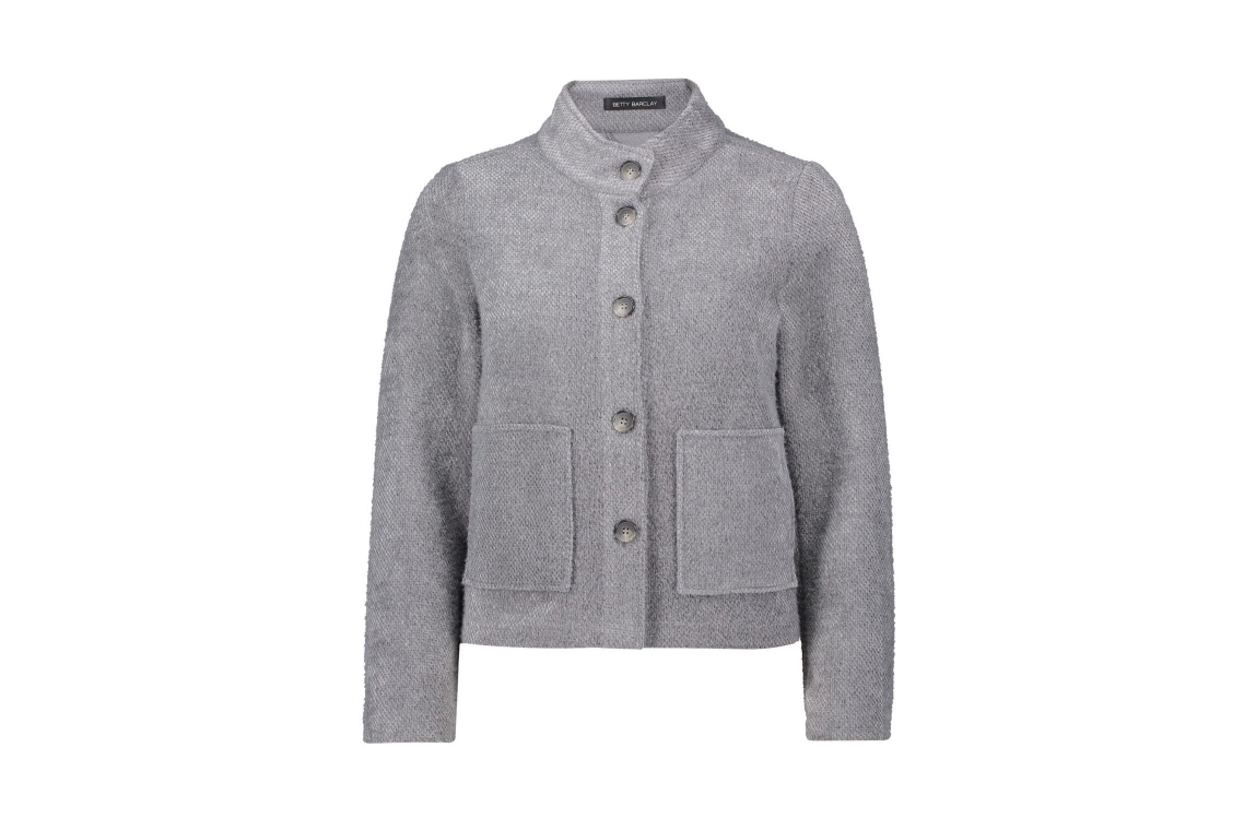 Betty Barclay Blazerjacke Kurz 1/1 Arm 9021 December sky. Dit rechtvallende model is voorzien van een opstaande kraag en heeft lange mouwen. Dit grijze vest van Betty Barclay sluit aan de voorzijde door middel van knopen.