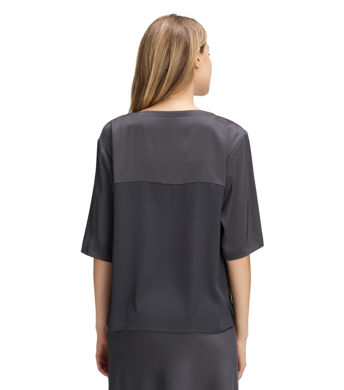 Betty Barclay Bluse Kurz 1/2 Arm 9095 Magnet. Dit rechtvallende model is voorzien van een ronde hals en heeft korte mouwen. Deze grijze blouse van Betty Barclay is aan de bovenzijde bewerkt met een glans.