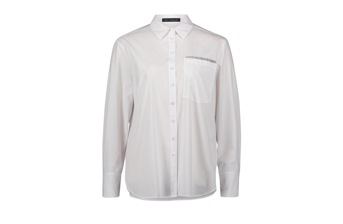 Betty Barclay Bluse Lang 1/1 Arm 1000 Bright white. Dit rechtvallende model is voorzien van een kraag, lange mouwen en sluit door middel van knopen. Deze witte blouse van Betty Barclay is op de linkerborst bewerkt met een borstzak en strass-steentjes.