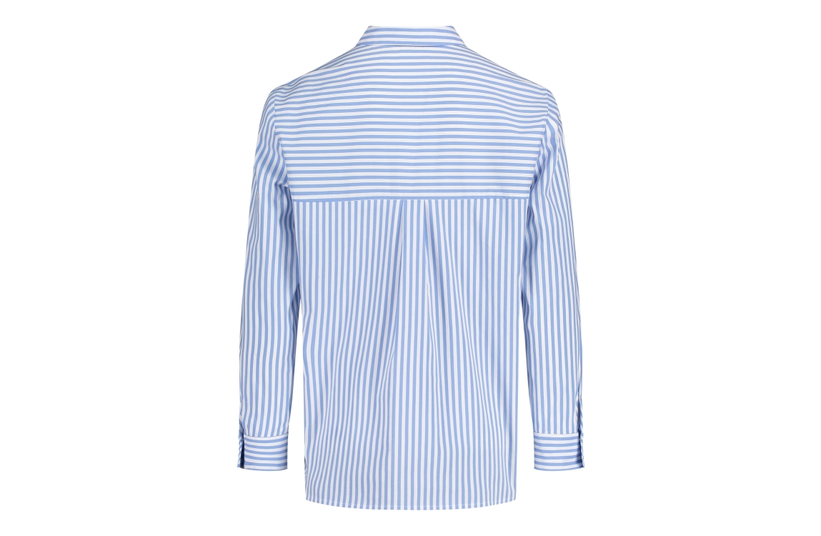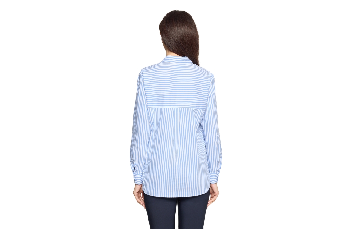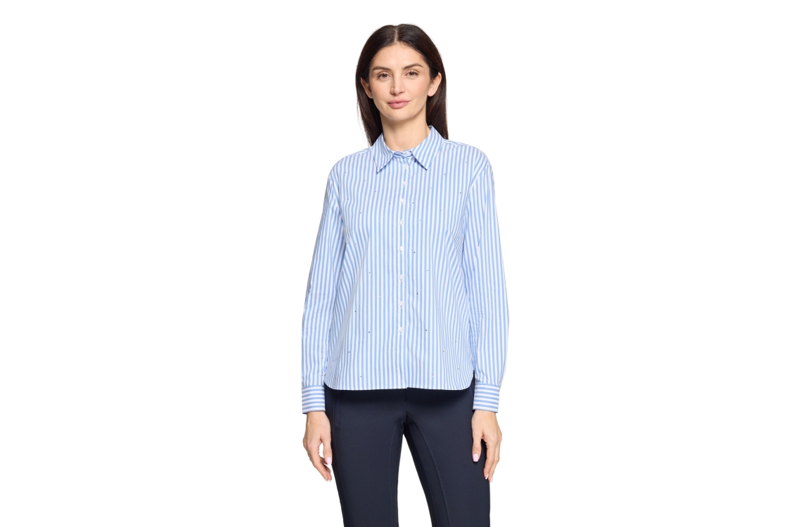 Betty Barclay blouse 80021758. Dit rechtvallend model is voorzien van een kraag en heeft lange mouwen. Deze blauw met wit gestreepte blouse van Betty Barclay sluit door middel van knopen en is aan de voorzijde bewerkt met zilverkleurige strass steentjes.