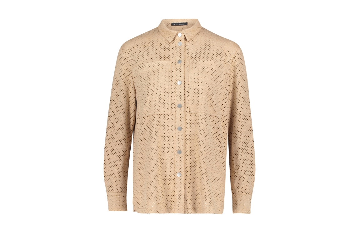 Betty Barclay blouse 8026/1835. Dit model is voorzien van een kraag en heeft lange mouwen afgewerkt met een split en knoop. Deze beige kleurige blouse van Betty Barclay sluit aan de voorzijde door middel van drukknopen en is voorzien van twee steekzakken. Dit model is uitgevoerd in een geperforeerde stof.