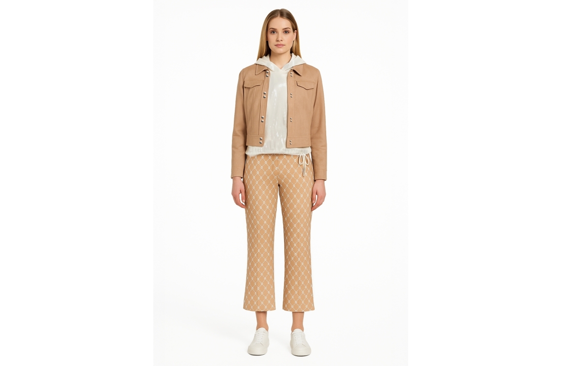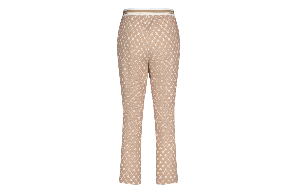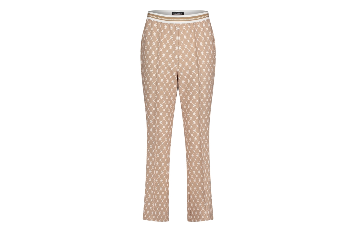 Betty Barclay broek 61431706. Dit rechtvallend model sluit aan de bovenzijde door middel van een elastische boord. Deze beige broek van Betty Barclay is bewerkt met een grafisch patroon en uitgevoerd in een licht materiaal.