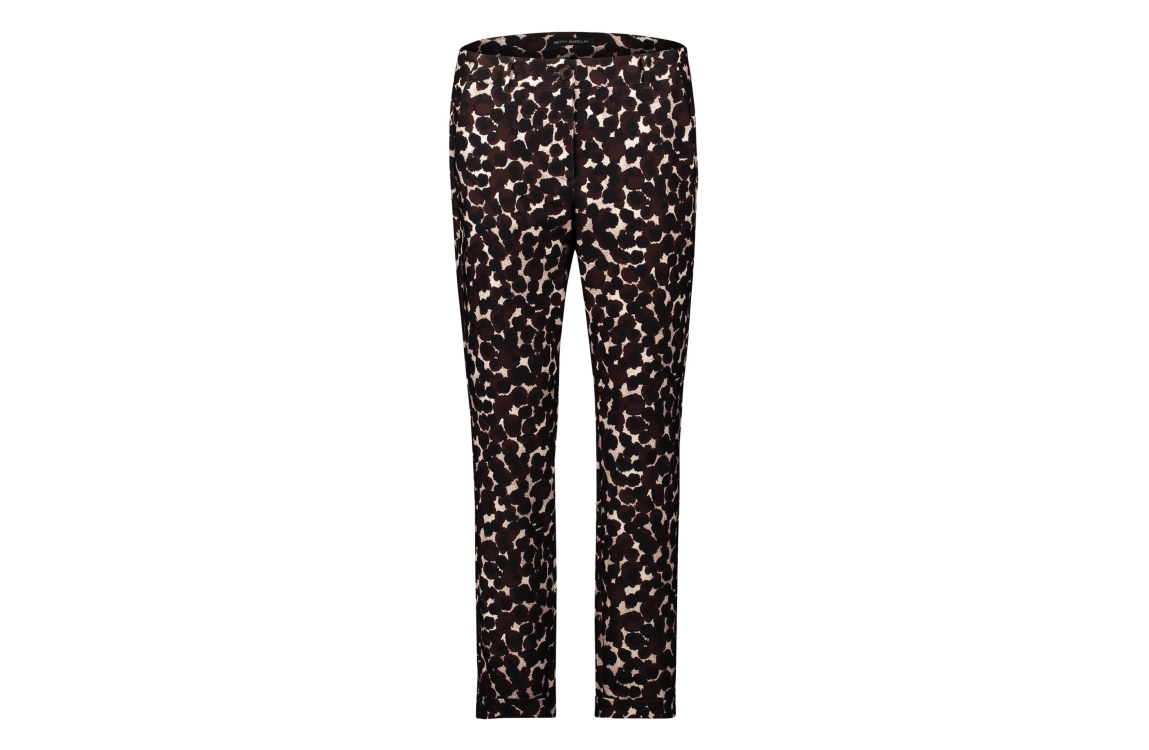 Betty Barclay broek 60981620. Dit regular fit model sluit door middel van een knoop- en ritssluiting en is voorzien van ceintuurlussen. Deze bruine broek van Betty Barclay is all-over bewerkt met een dierenprint en is uitgevoerd in stretchkwaliteit.