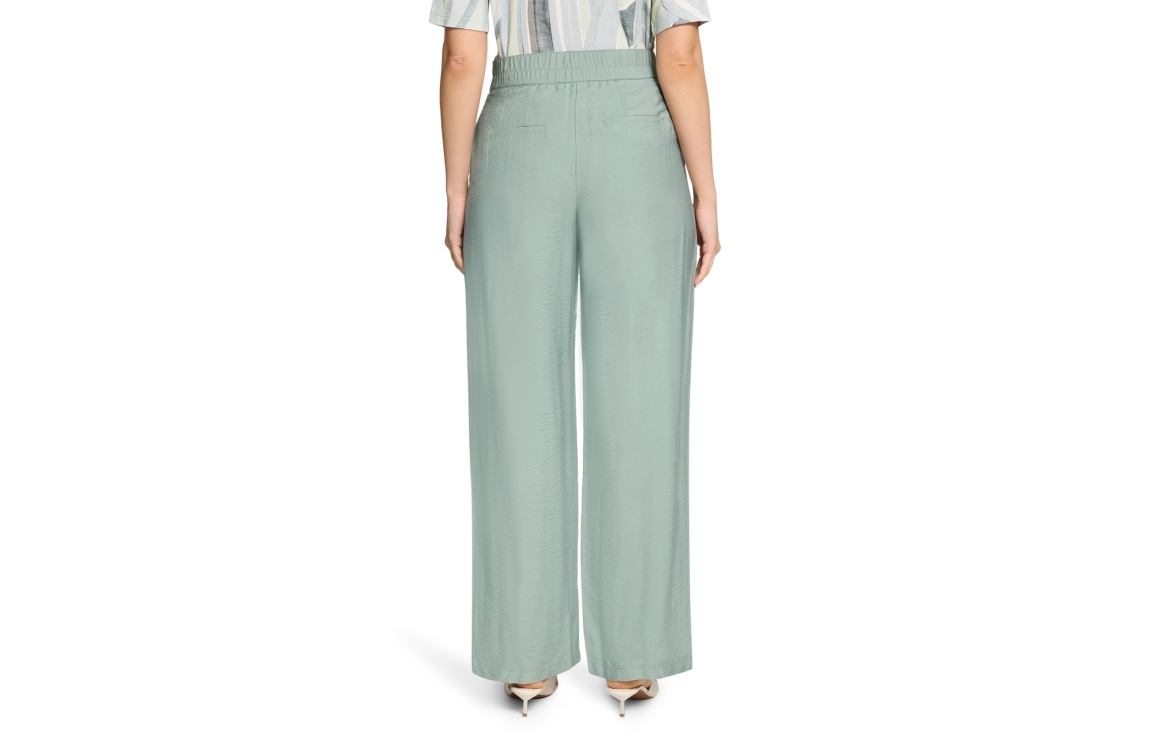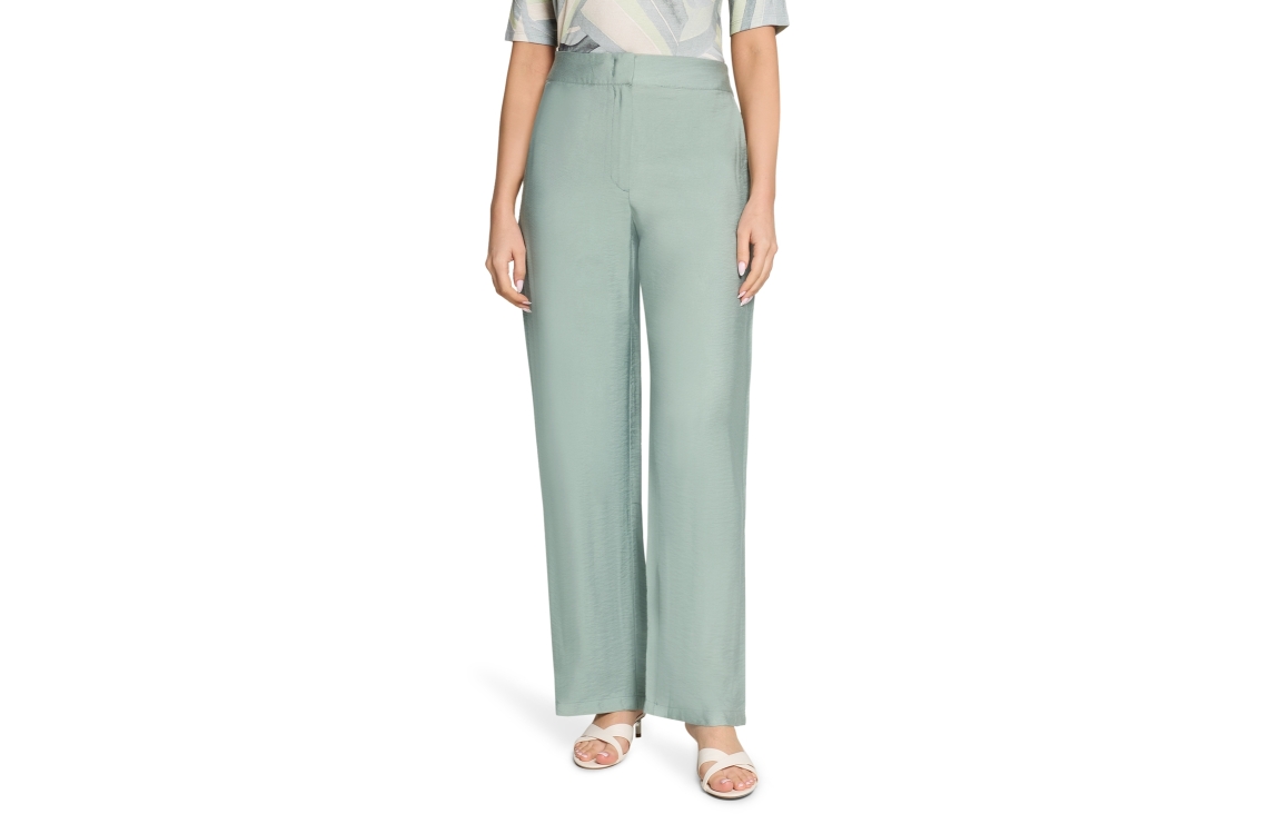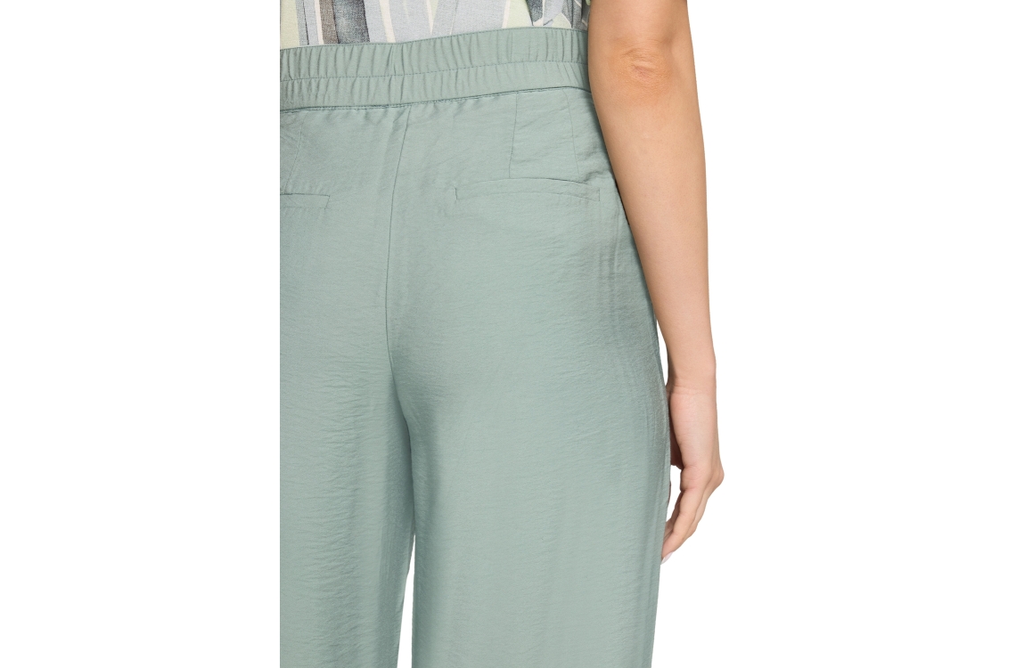 Betty Barclay broek 61641836. Dit soepelvallende model sluit door middel van een knoop en rits. Deze groene broek van Betty Barclay is aan de voorzijde voorzien van twee schuine steekzakken en aan de achterzijde voorzien van twee decoratieve paspelzakken.