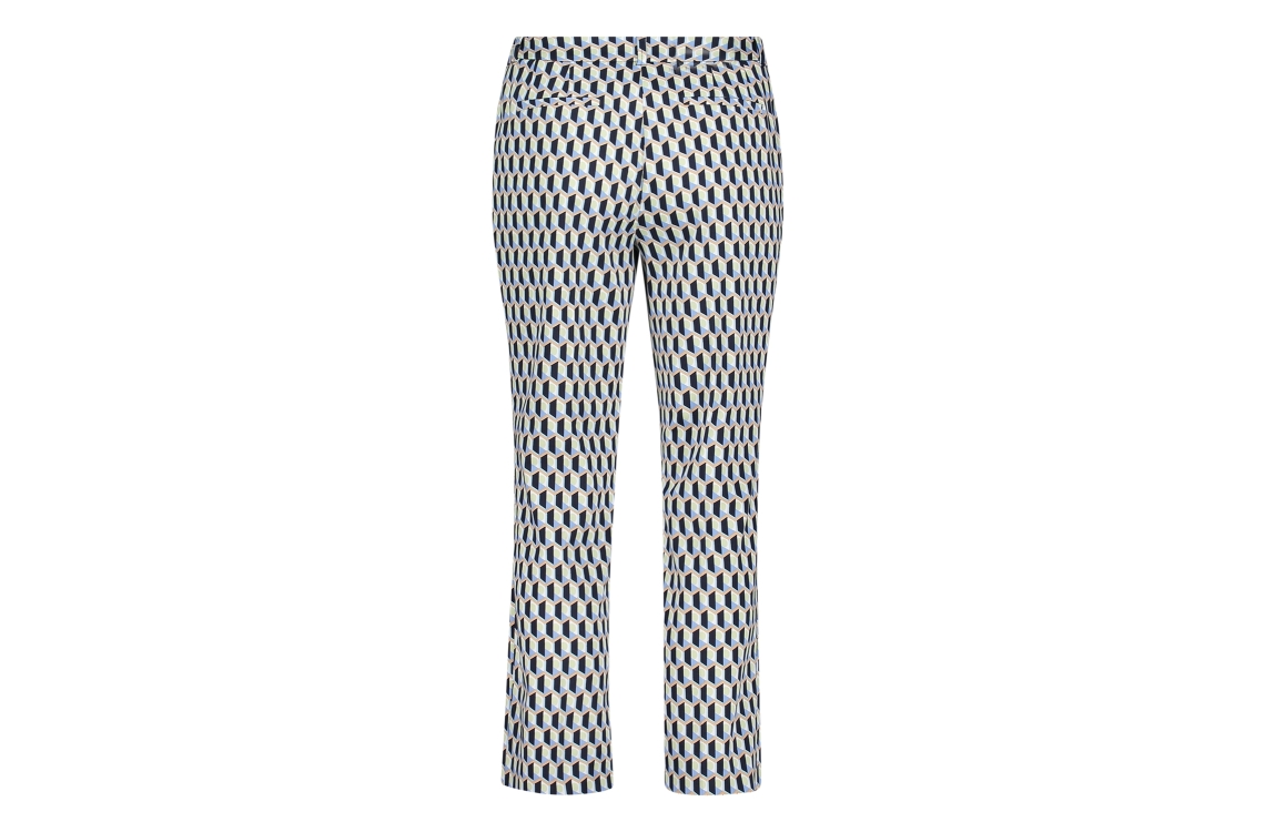 Betty Barclay broek 6157/1857. Dit aangesloten model sluit door middel van een knoop en rits. Deze blauw/groene broek van Betty Barclay is aan de voorzijde voorzien van twee schuine steekzakken en aan de achterzijde voorzien van twee decoratieve paspelzakken. Dit model is bewerkt met een all over grapfisch motief.