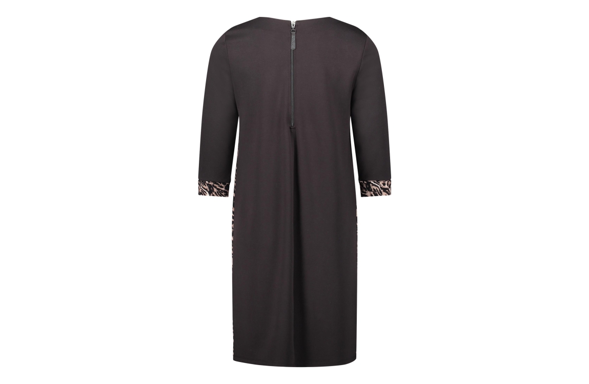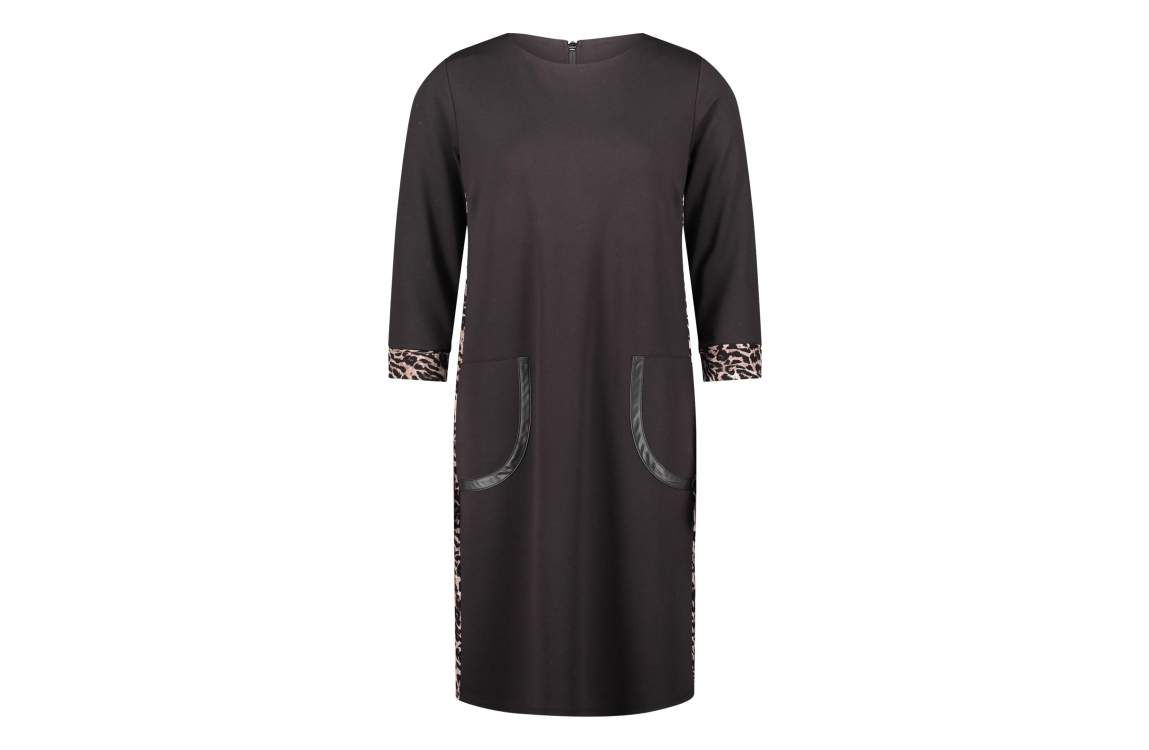Betty Barclay 1761/2250/9045. Dit rechtvallend model heeft een boothals en middellange mouwen. Deze zwarte jurk van Betty Barclay sluit aan de achterzijde door middel van een rits en is aan de zijkanten en mouwboorden bewerkt met een panterprint. Het model is gedetailleerd met opgestikte steekzakken aan de voorzijde en is uitgevoerd in stretchkwaliteit.