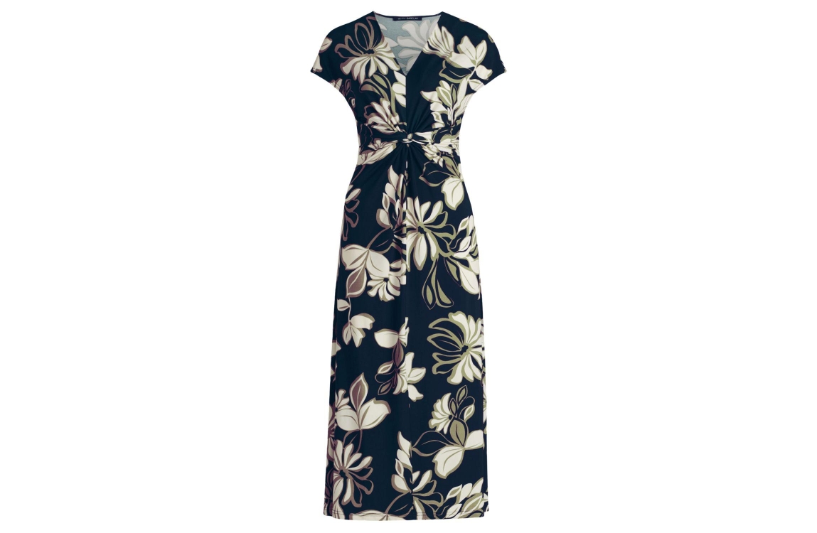 Betty Barclay jurk 1757/1413/8857. Dit aangesloten model heeft een V-hals en korte mouwen. Deze donkerblauwe jurk van Betty Barclay is all-over bewerkt met een bloemenprint in verschillende kleuren en is uitgevoerd in stretchkwaliteit. Het model is op de taille afgewerkt met een knoopdetail.