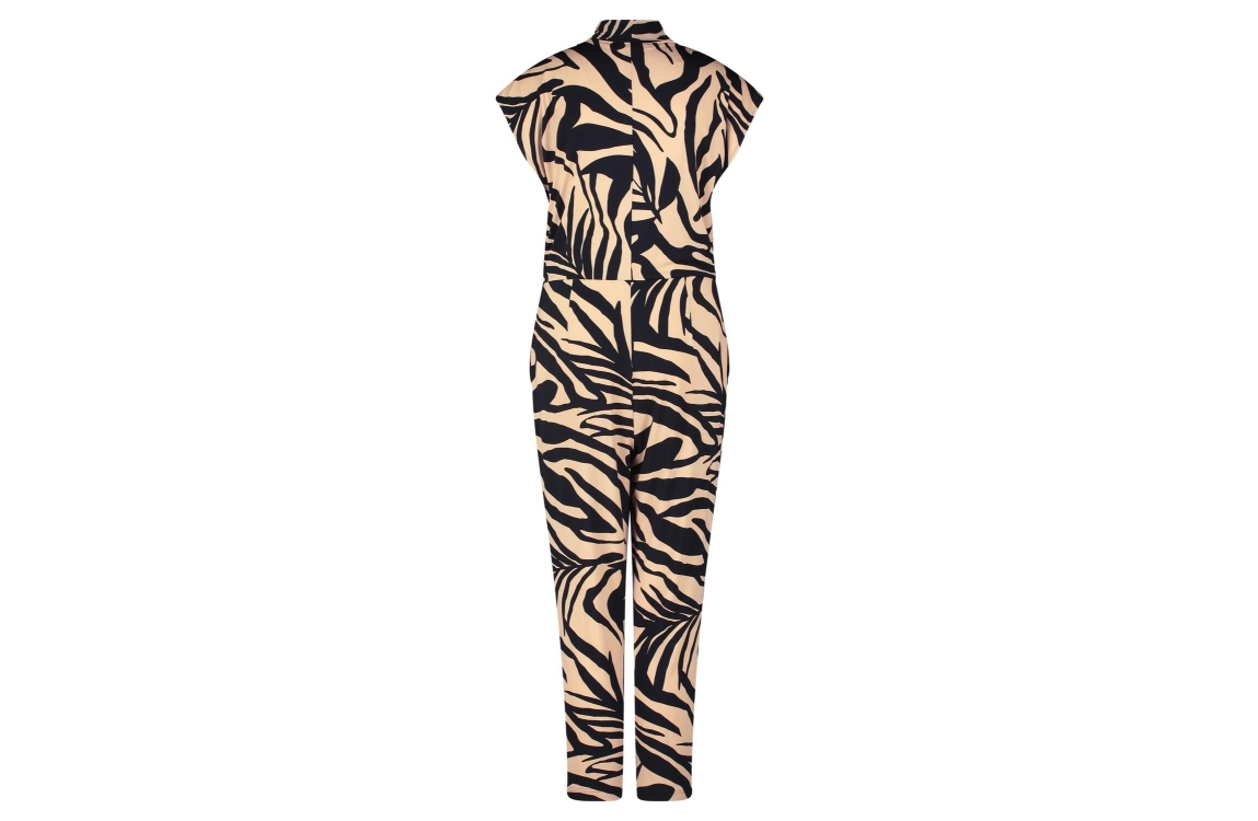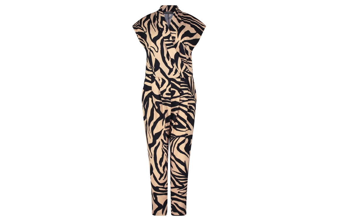 Betty Barclay Online jumpsuit 6053/1224/9875. Dit regular fit model heeft een omgeslagen kraag met V-uitsnijding en korte afgekapte mouwen. Deze zwarte jumpsuit van Betty Barclay is op het voorpand bewerkt met plooidetails en beschikt over twee steekzakken. Het model is uitgevoerd in een grafische print in een beige dessin en is uitgevoerd in stretchkwaliteit.