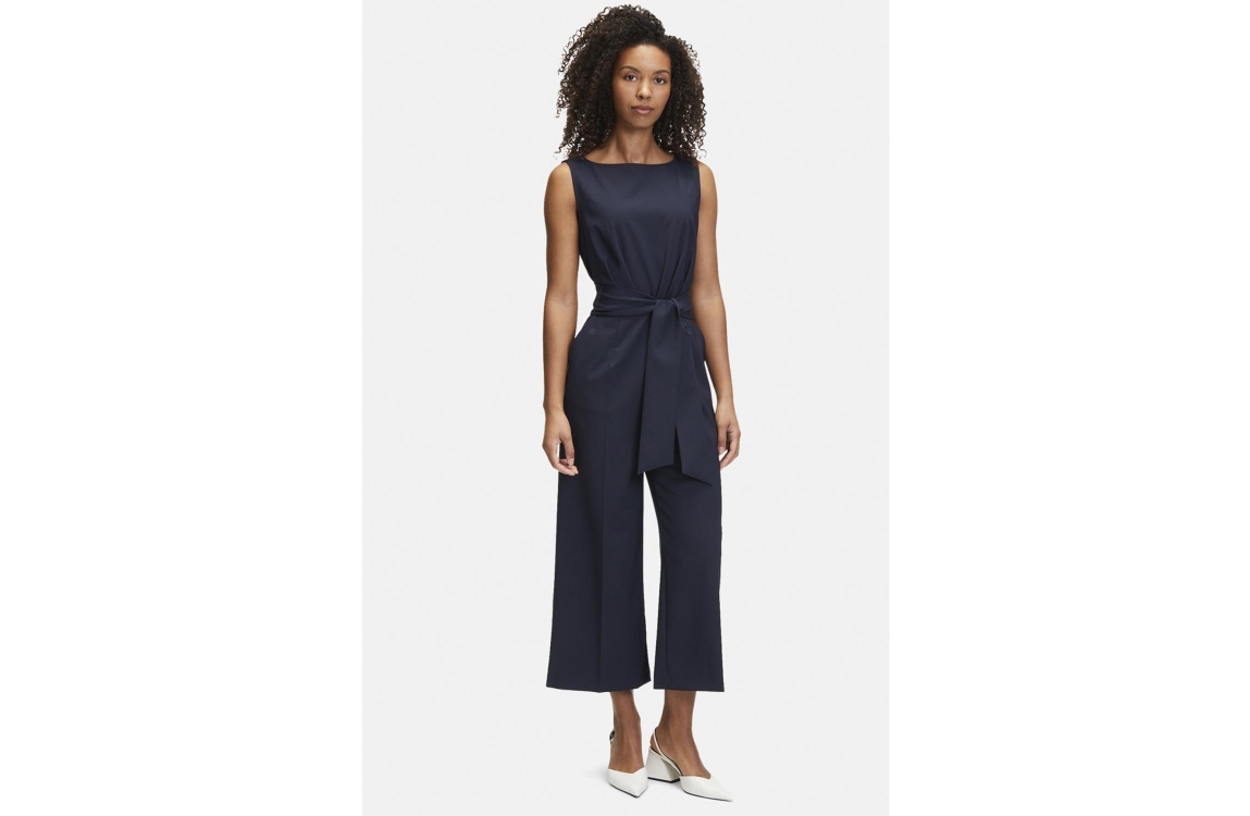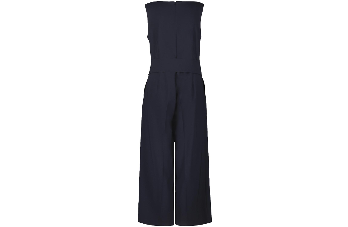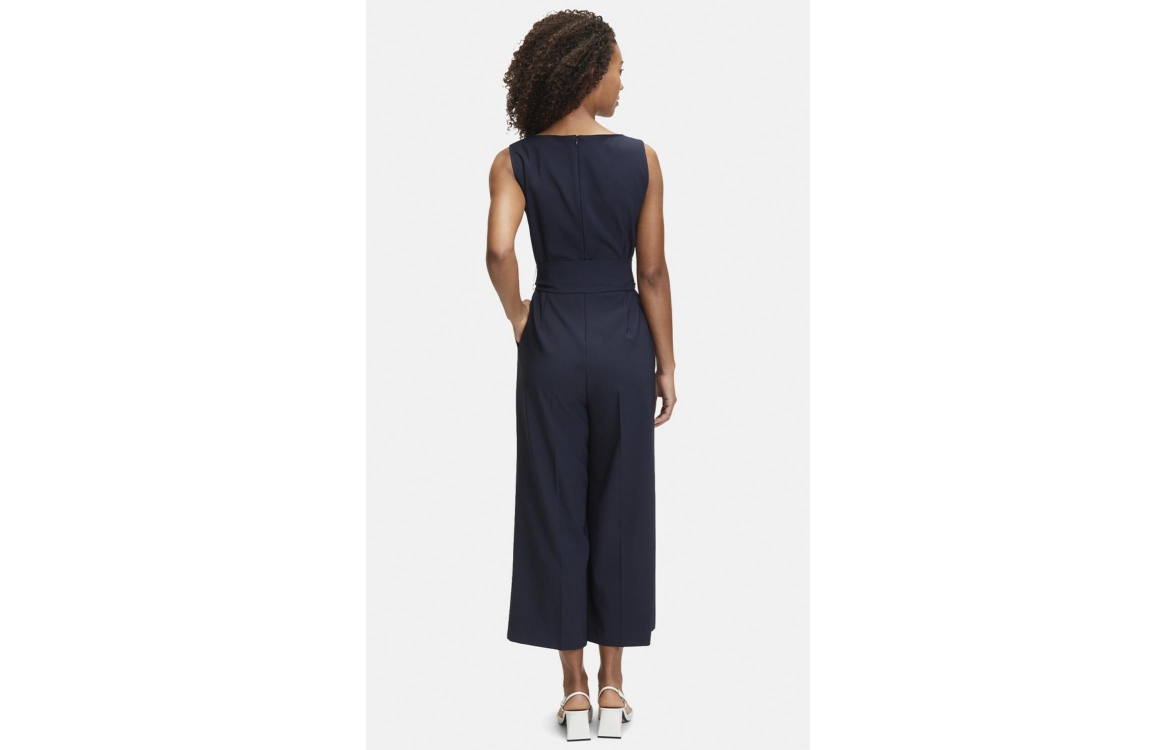 Betty Barclay jumpsuit. Dit donkerblauwe model is voorzien van een ronde hals, is mouwloos en heeft driekwart pijpen. Deze donkerblauwe jumpsuit van Betty Barclay sluit door middel van een rits aan de achterzijde en is in de taille aan te snoeren door middel van een ceintuur. Dit model heeft wijde pijpen.
