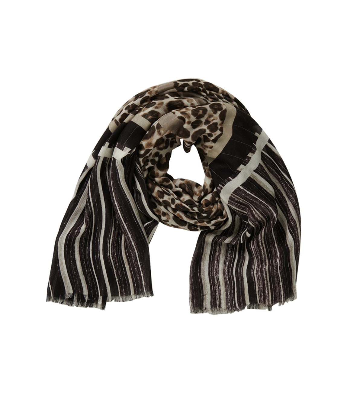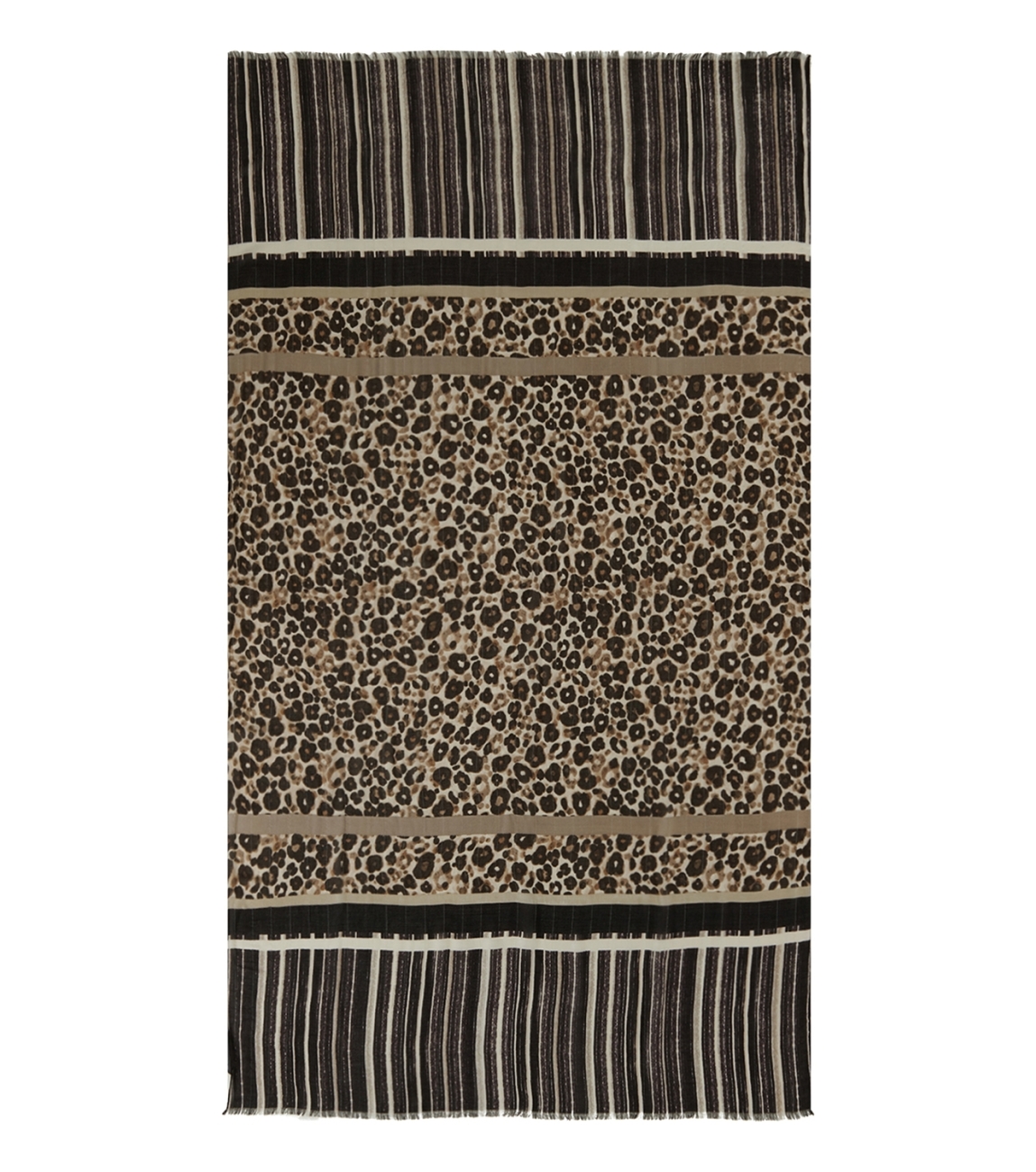 Betty Barclay sjaal 34731650 7874. Dit rechthoekige model is all-over bewerkt met een panter- en streepprint en is gedetailleerd met ruffles.