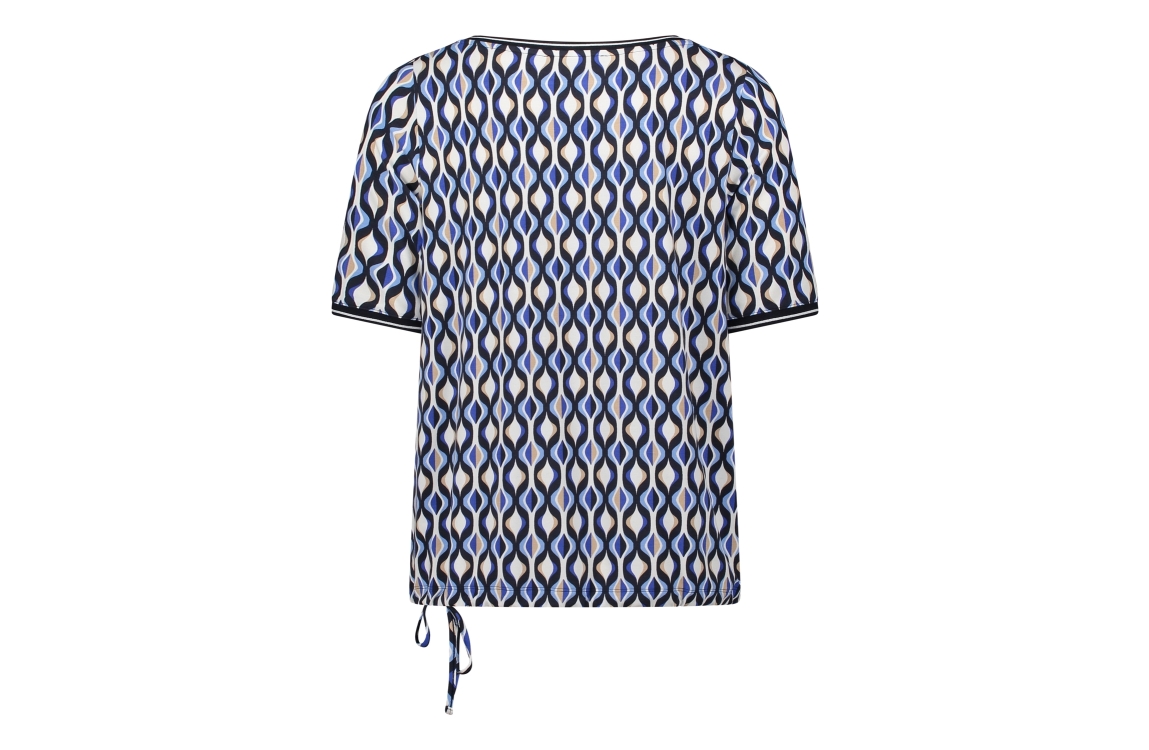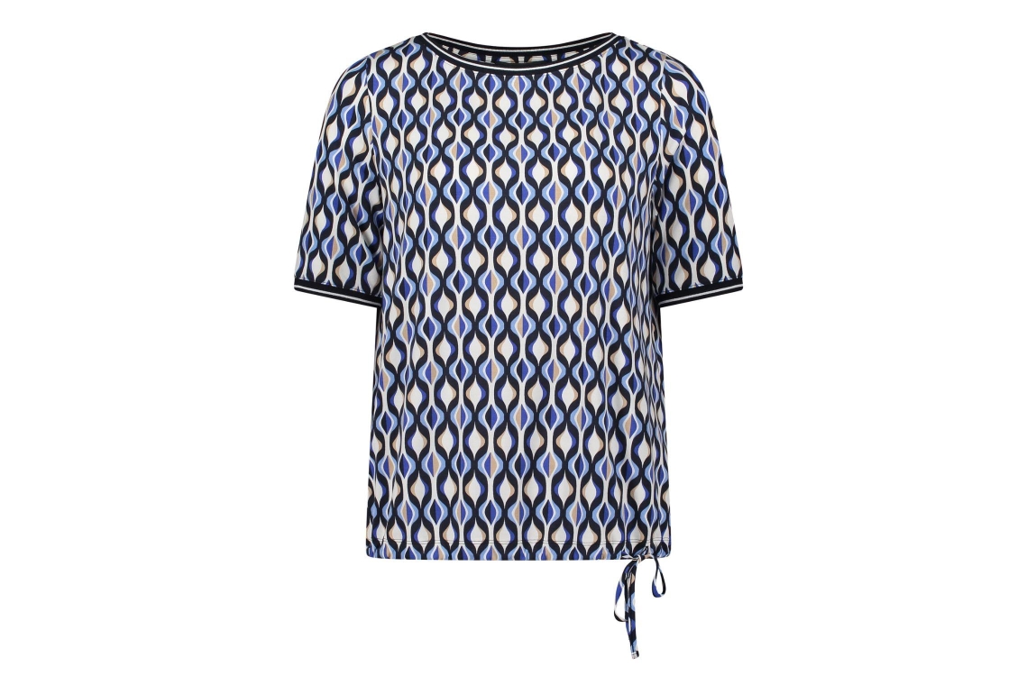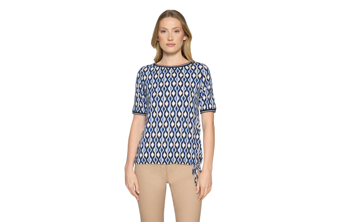 Betty Barclay Shirt Kurz 1/2 Arm 8811 Blue/cream. Dit rechtvallende model heeft een ronde hals en korte mouwen. Dit donkerblauwe shirt van Betty Barclay is bewerkt met een print en is uitgevoerd in stretchkwaliteit. Het model is aan de zoom afgewerkt met elastische boord met een knoopdetail.