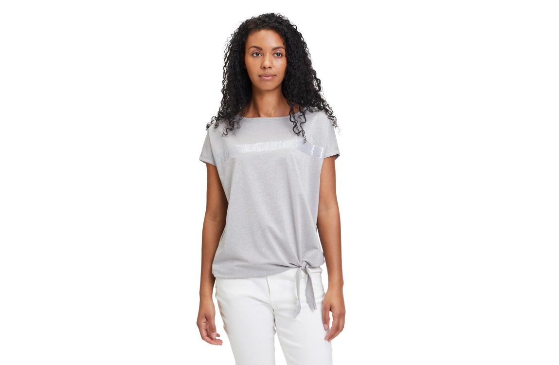 Betty Barclay top 2084/2449/9008. Dit rechtvallend model heeft een ronde hals en korte mouwen. Deze grijze top van Betty Barclay is aan de voorzijde bewerkt met pailetten en all-over bewerkt met glitters.