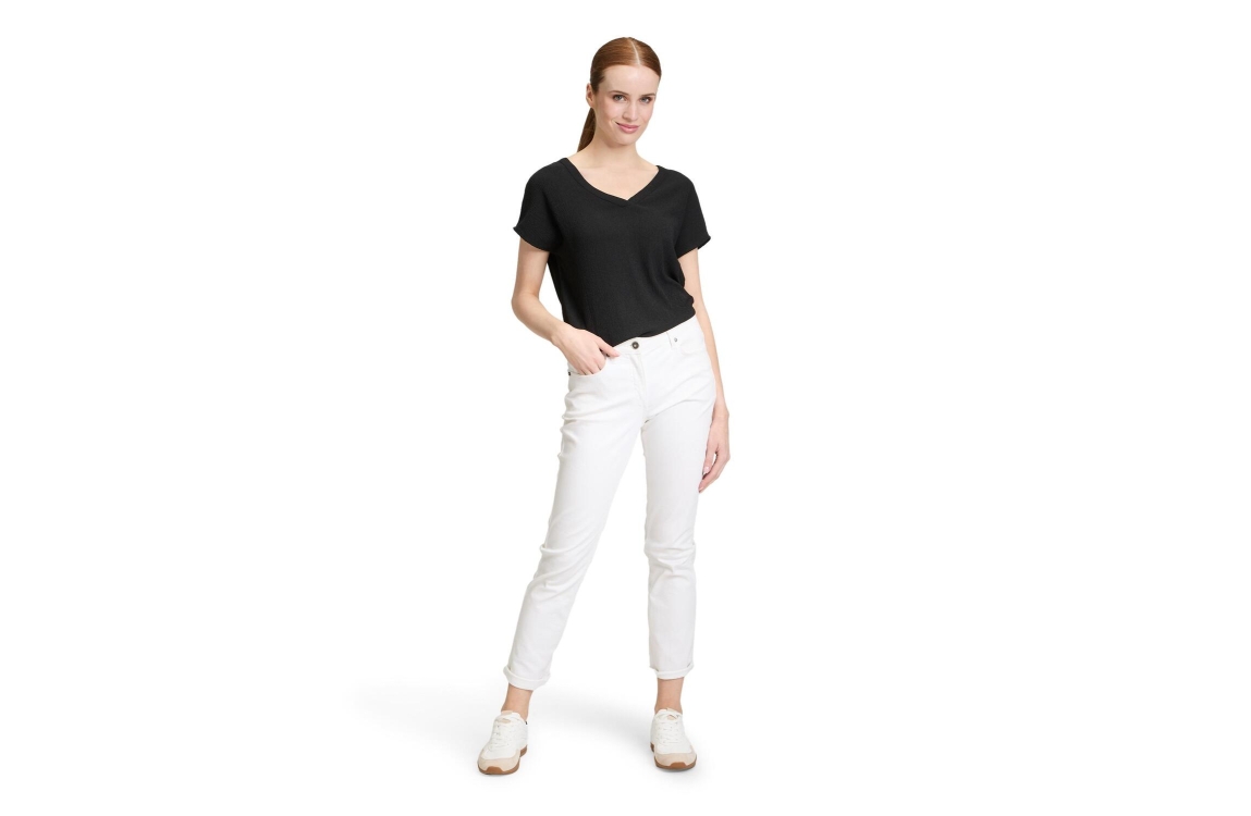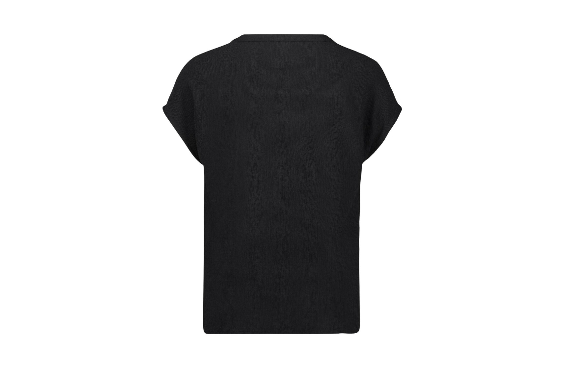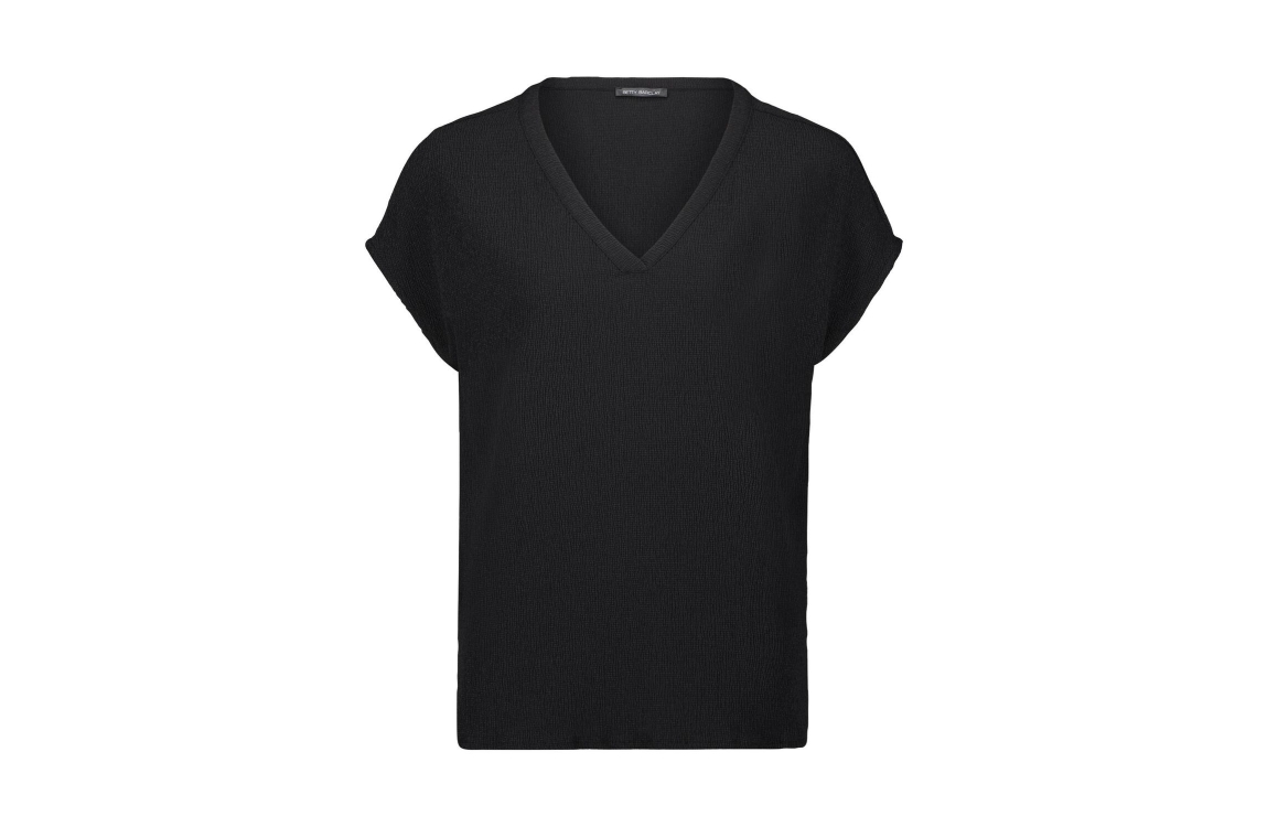 Betty Barclay Online top 2509/1405/9045. Dit wijdvallend model heeft een V-hals en korte afgekapte mouwen. Deze zwarte top van Betty Barclay is uitgevoerd in stretch kwaliteit en is all-over bewerkt met een subtiele structuur.