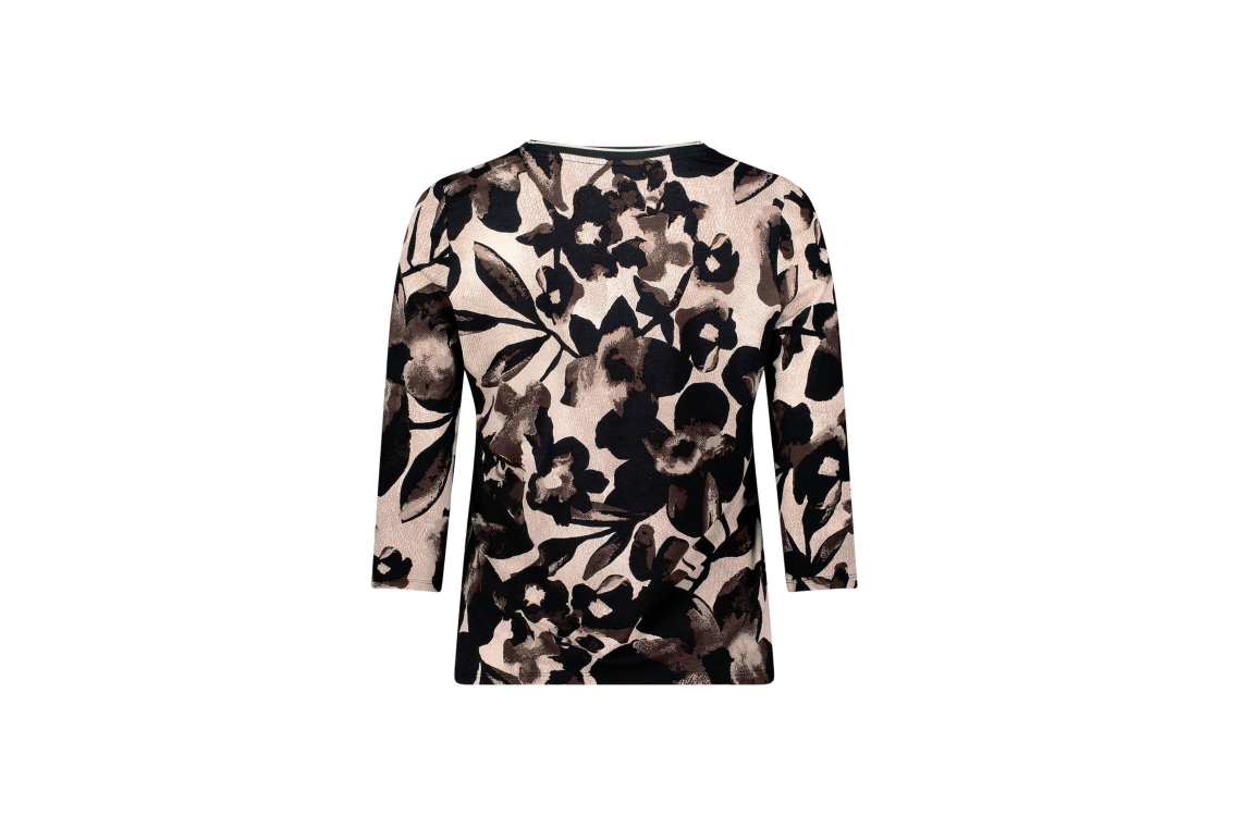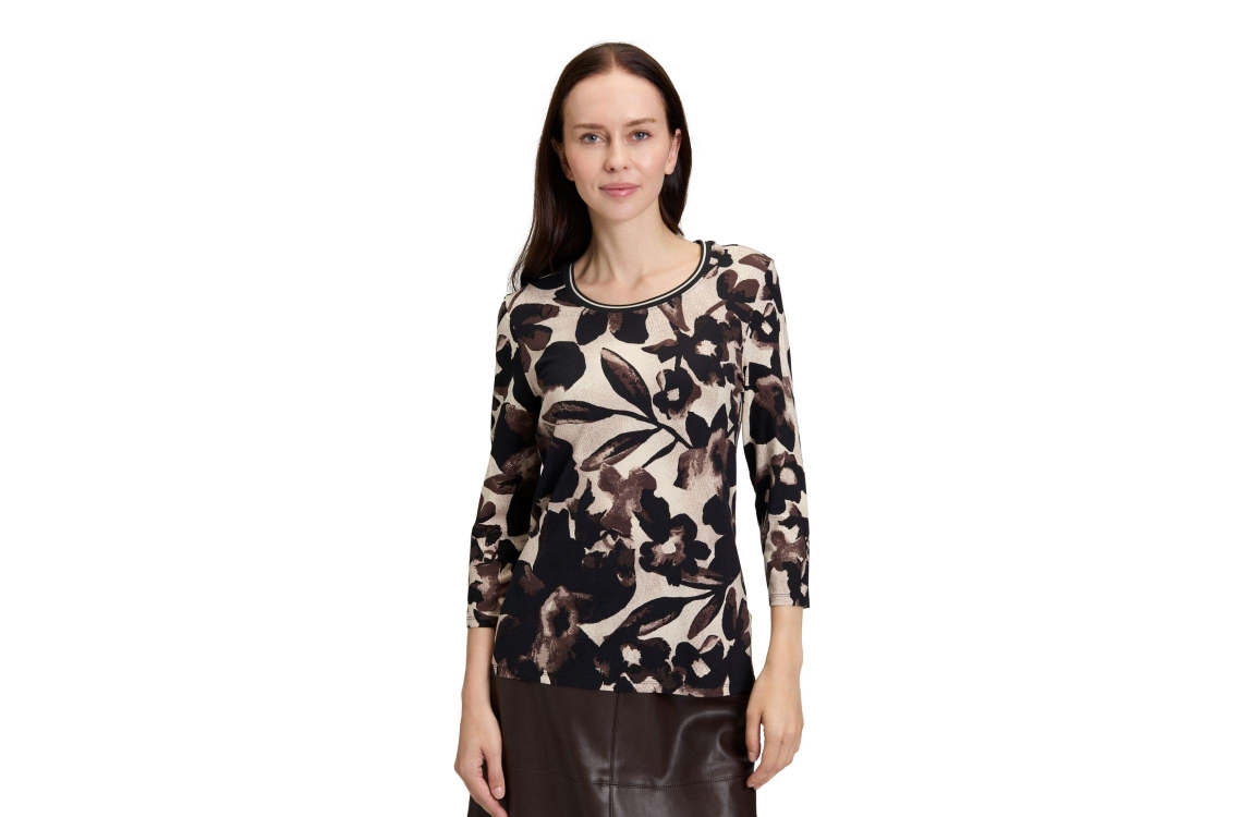 Betty Barclay Shirt Kurz 3/4 Arm 7875 Beige/brown. Dit rechtvallende model heeft een ronde hals en driekwart mouwen. Dit zwarte shirt van Betty Barclay is all-over bewerkt met een bruin/beige bloemenprint en is uitgevoerd in stretchkwaliteit.