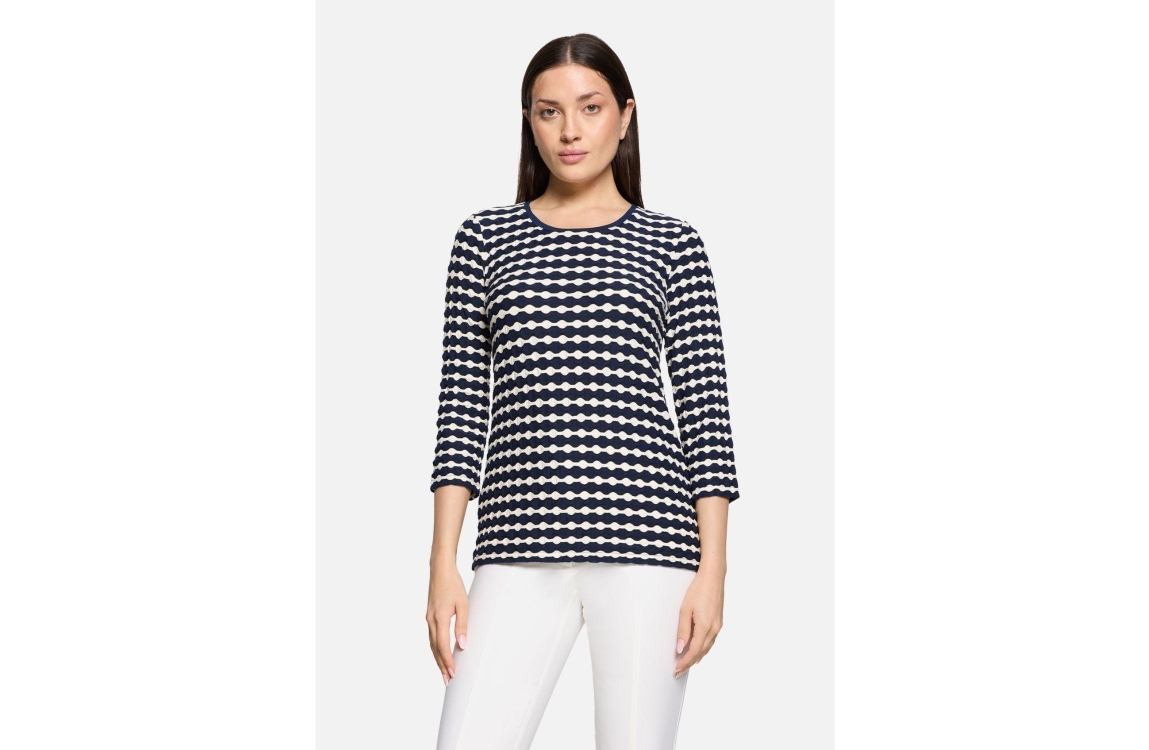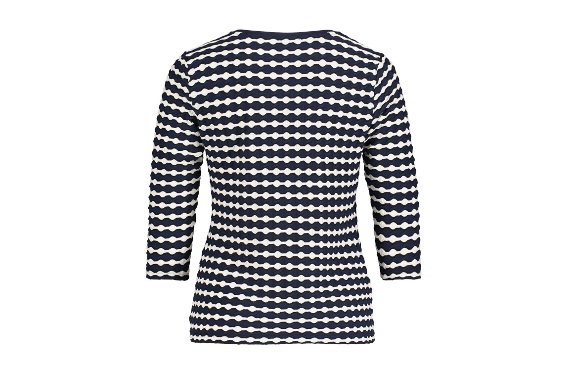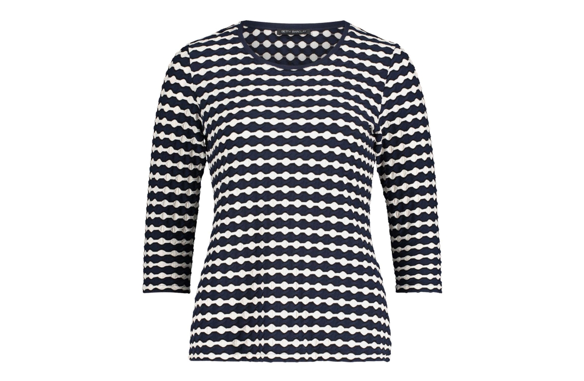 Betty Barclay Shirt Kurz 3/4 Arm 8813 Dark blue/cream. Dit aangesloten model is voorzien van een ronde hals en heeft driekwart mouwen. Dit donker blauwe shirt van Betty Barclay is bewerkt met een gestreept print blauw en wit.