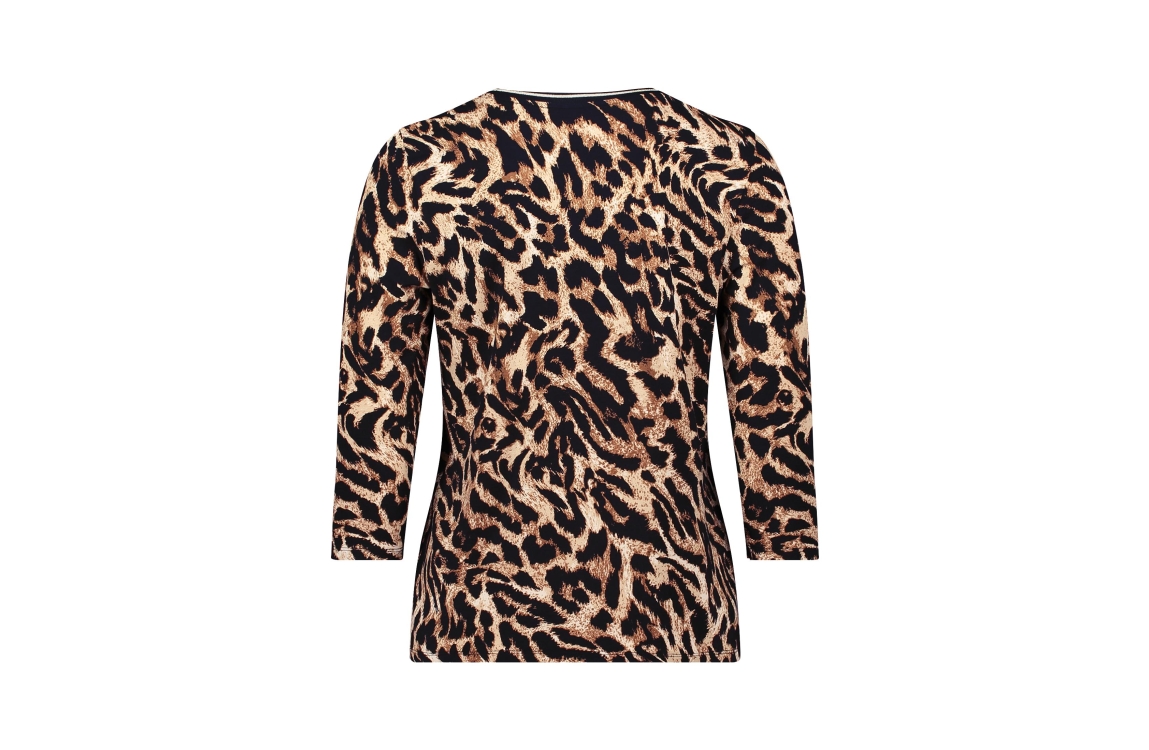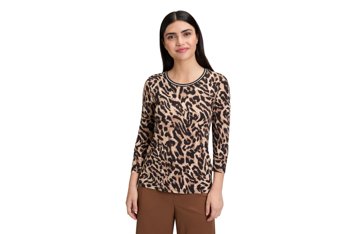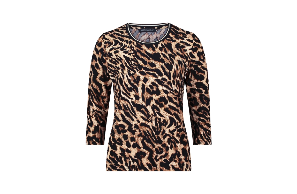 Betty Barclay shirt 2551/1563/9875. Dit rechtvallend model heeft een ronde hals en driekwart mouwen. Deze zwarte shirt van Betty Barclay is all-over bewerkt met een bruine panterprint en is uitgevoerd in stretchkwaliteit.