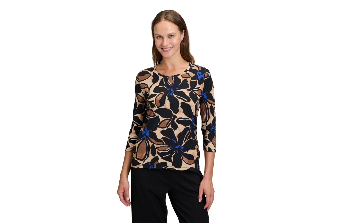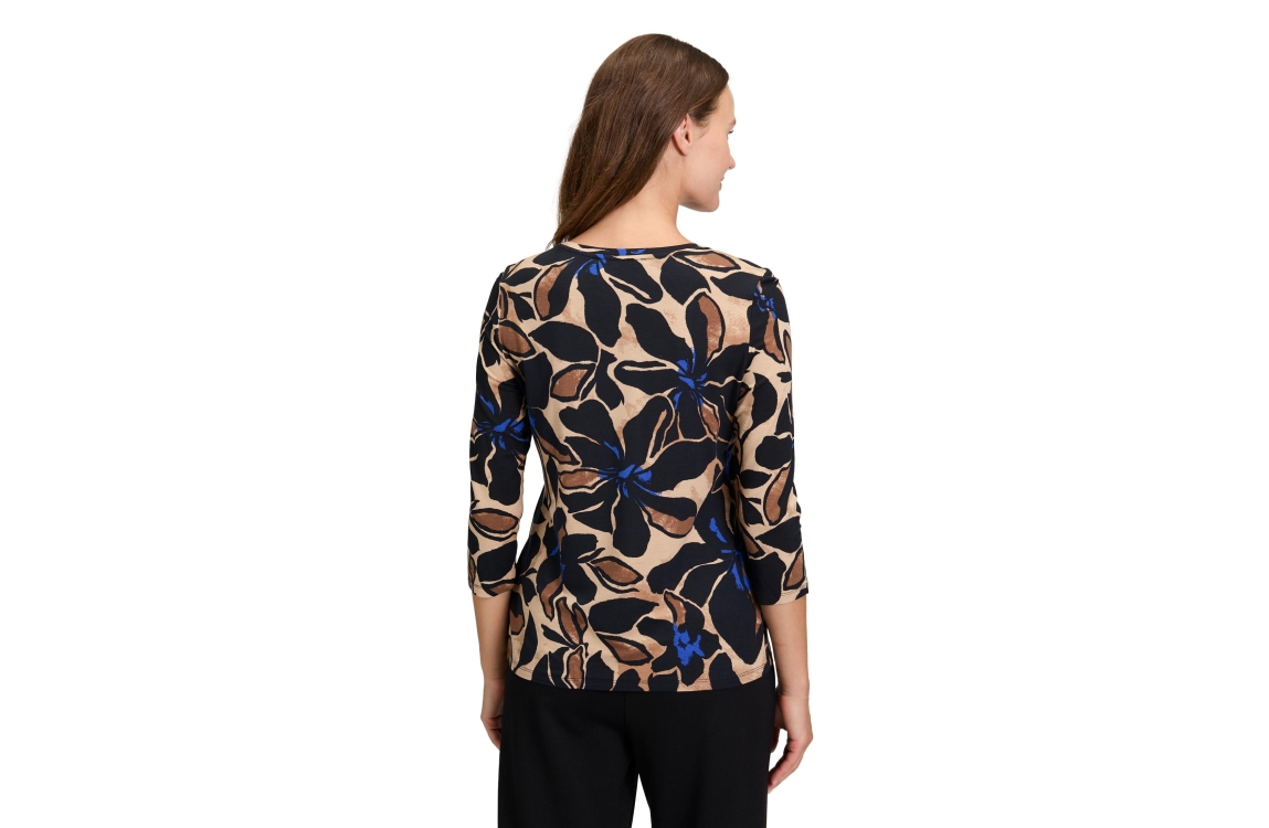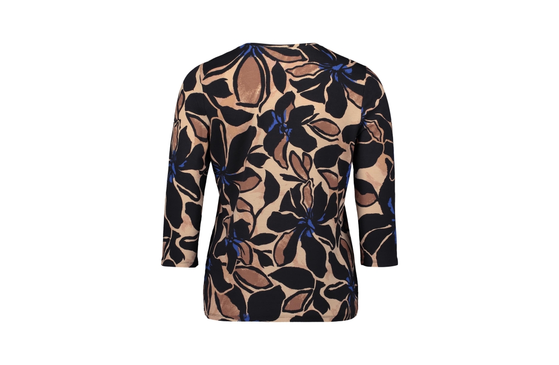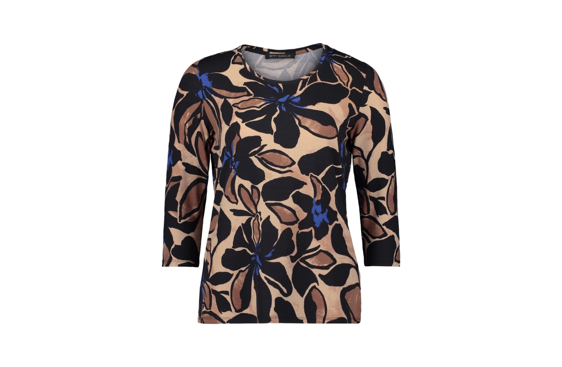 Betty Barclay shirt 2553/1457/9880. Dit rechtvallend model heeft een ronde hals en driekwart mouwen. Deze zwarte shirt van Betty Barclay is all-over bewerkt met een grafische print in verschillende kleuren en is uitgevoerd in stretchkwaliteit.