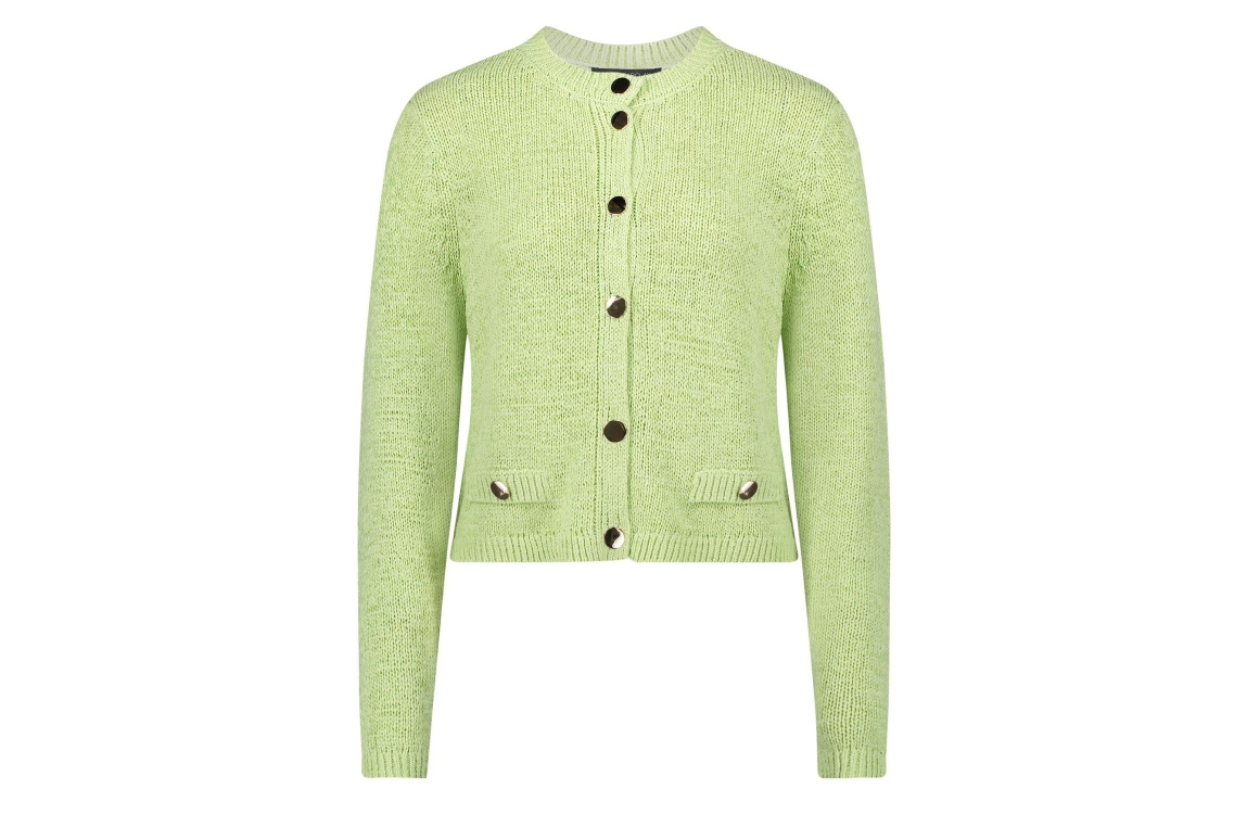 Betty Barclay Strickjacke Kurz 1/1 Arm 5341 Foam green. Dit rechtvallende model is voorzien van een ronde hals en heeft lange mouwen. Dit groene vest van Betty Barclay sluit door middel van knopen en beschikt over twee sierzakken.