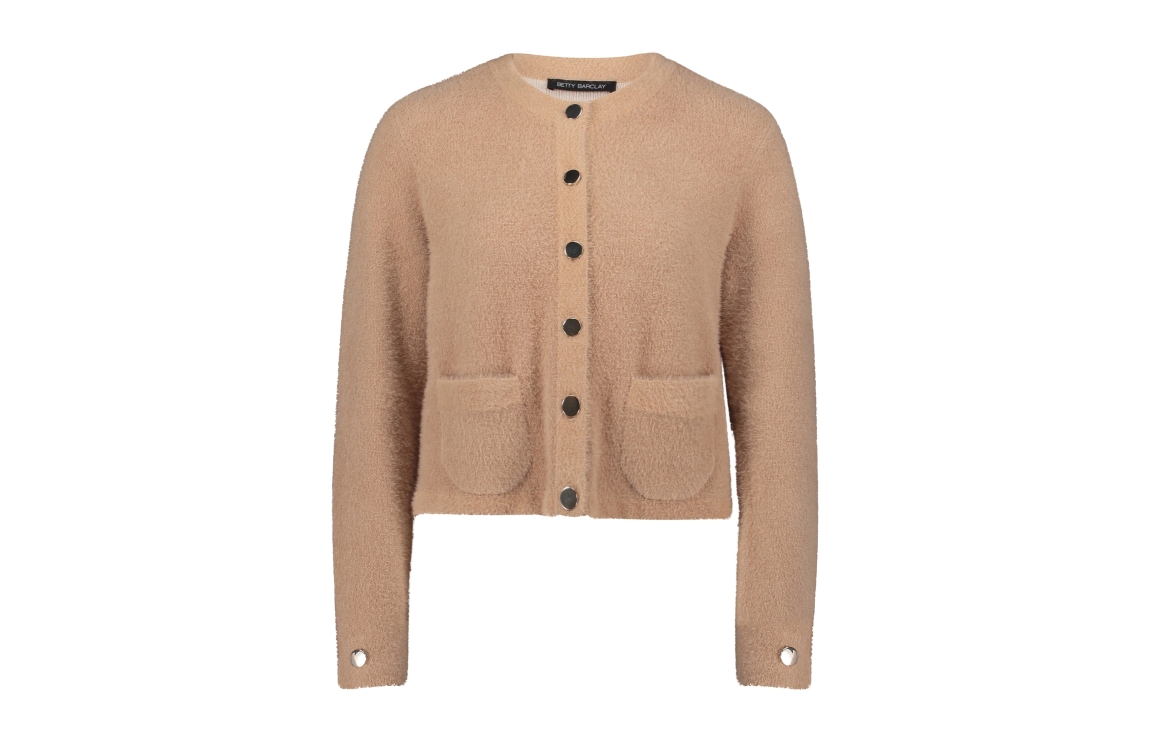 Betty Barclay vest 53801711. Dit rechtvallend model is voorzien van een ronde hals en heeft lange mouwen. Deze camel kleurige zachte vest van Betty Barclay sluit door middel van knopen en beschikt over twee opgestikte zakken.