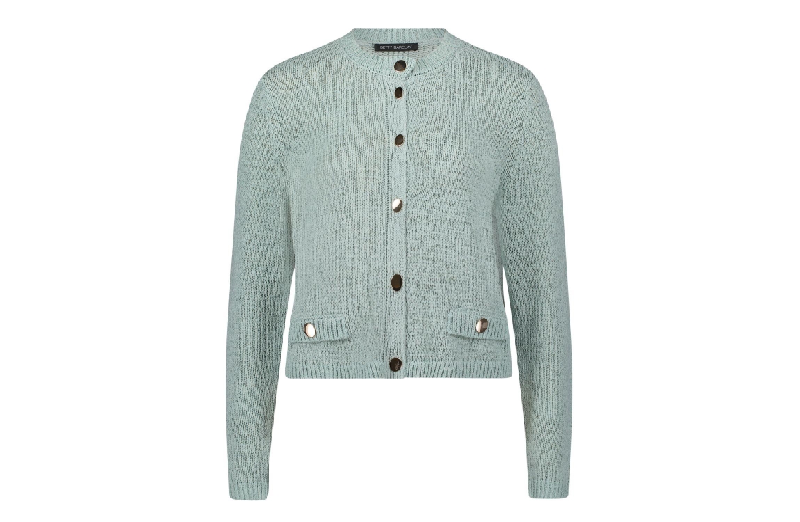 Betty Barclay Strickjacke Kurz 1/1 Arm 8270 Gray mist. Dit rechtvallende model is voorzien van een ronde hals en heeft lange mouwen. Deze groen/grijze vest van Betty Barclay sluit door middel van knopen en beschikt over twee sierzakken.
