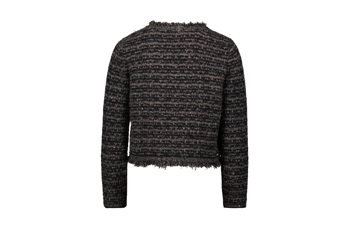 Betty Barclay vest 53321609 9978. Dit rechtvallende model heeft een brede, ronde halslijn en lange mouwen. Deze zwarte vest van Betty Barclay sluit aan de voorzijde door middel van knoopsluitingen en is uitgevoerd in tweed-kwaliteit. Het model is gedetailleerd met pailletten en ruffles.