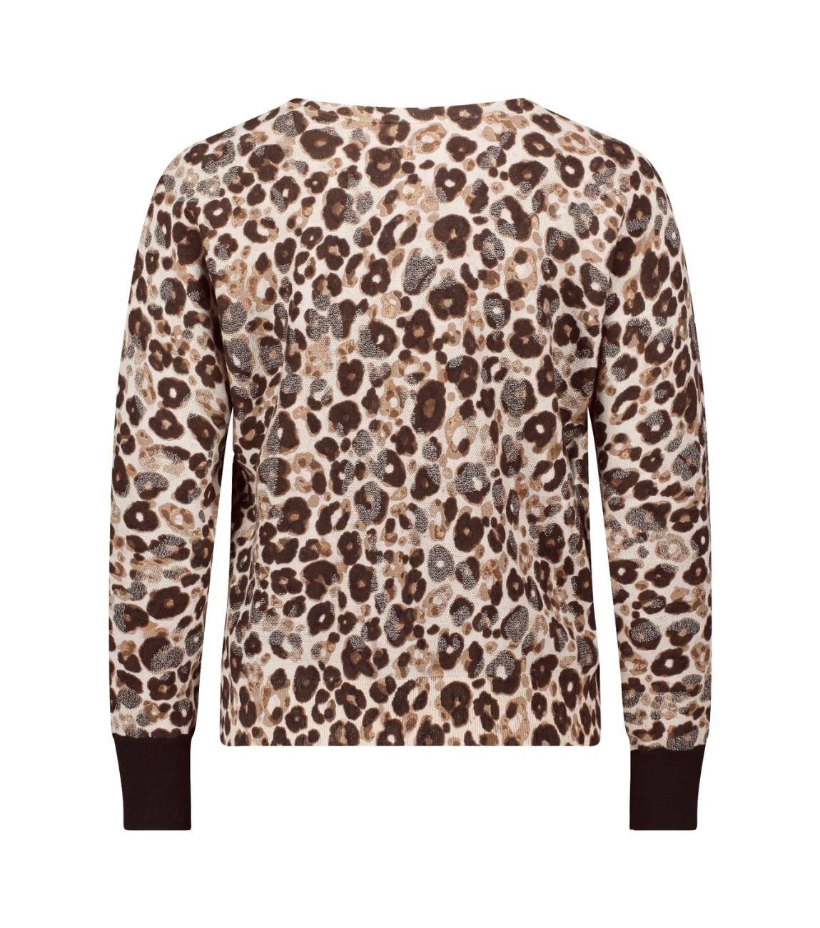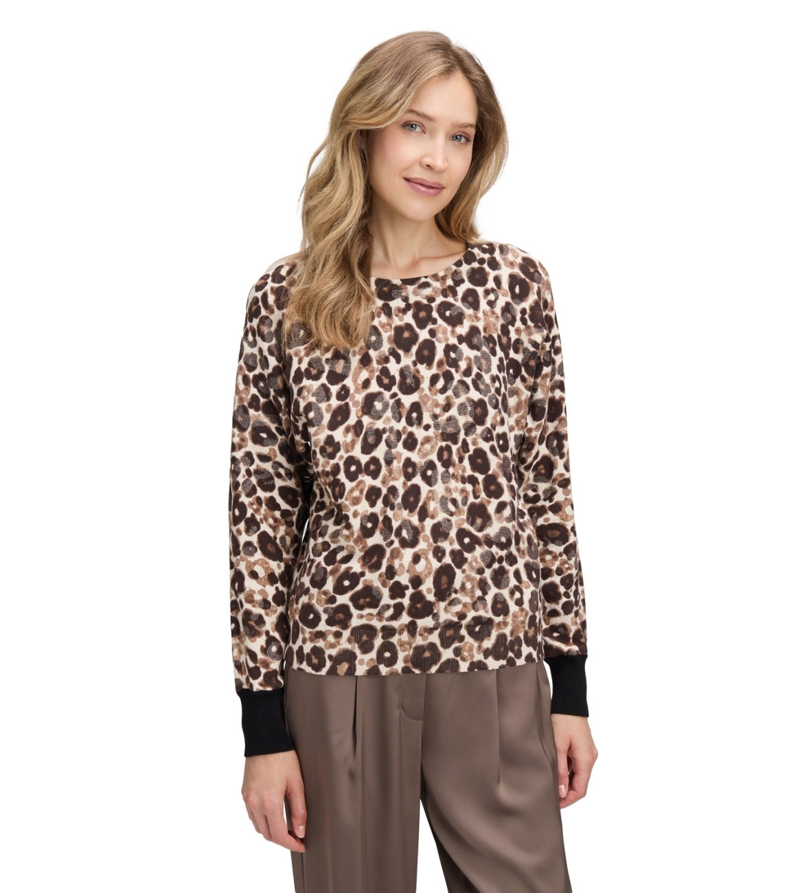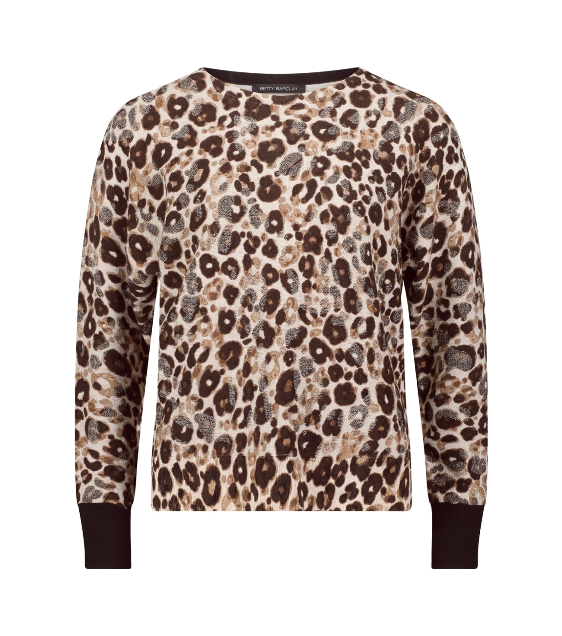 Betty Barclay pullover 53211596. Dit rechtvallende model heeft een ronde halslijn en lange mouwen. Deze taupekleurige pullover van Betty Barclay is all-over bewerkt met een panterprint in verschillende tinten en heeft ribgebreide boorden.