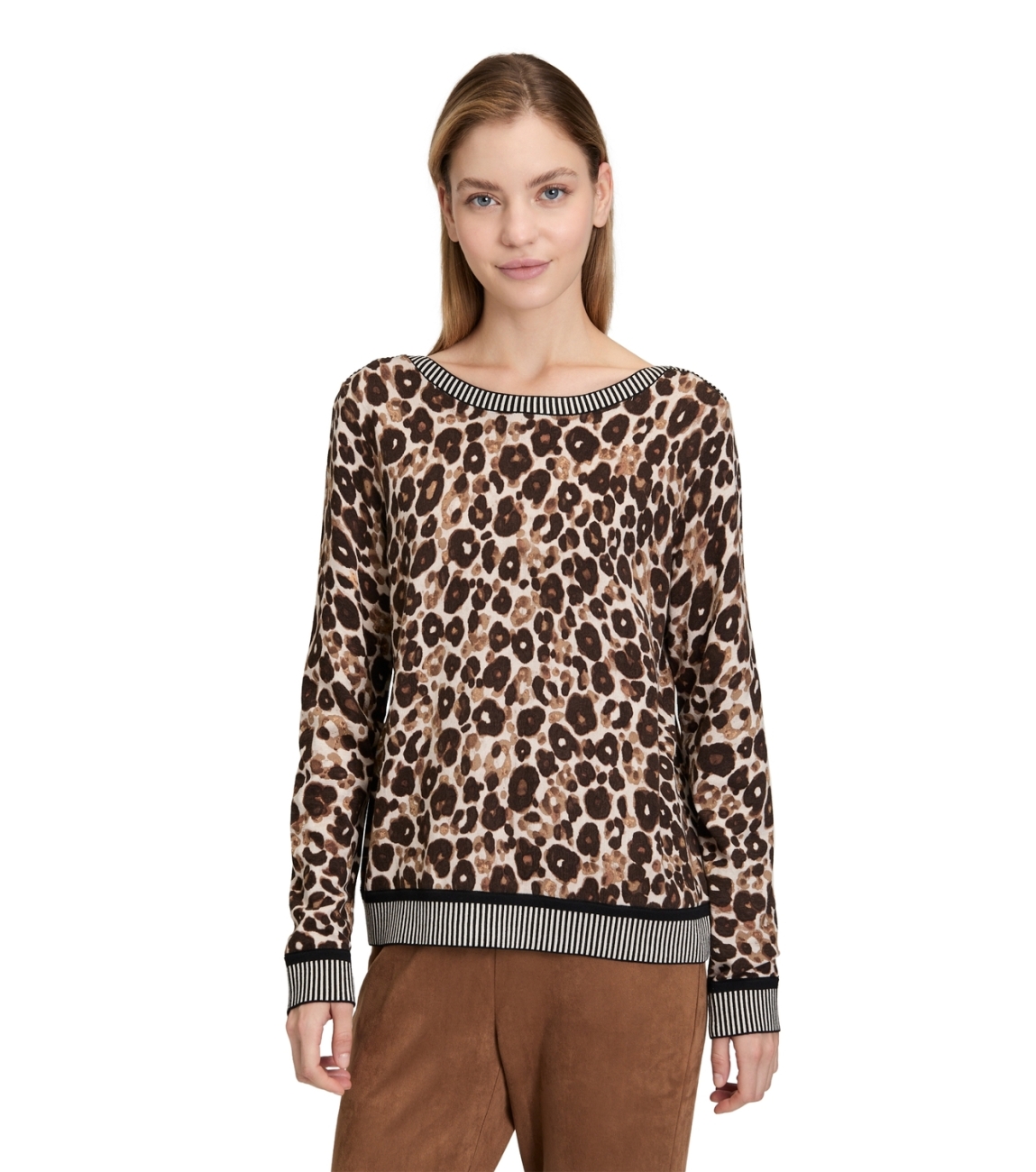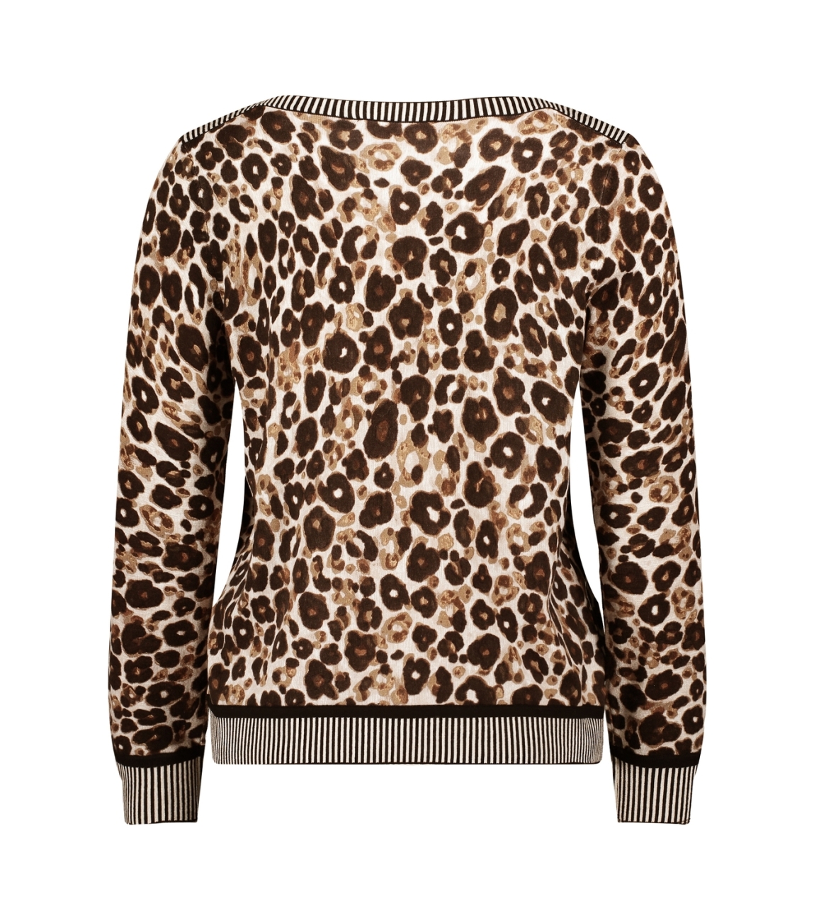 Betty Barclay Strickpullover Kurz 1/1 Arm 7873 Taupe/beige. Dit rechtvallende model heeft een ronde halslijn en lange mouwen. Deze taupekleurige pullover van Betty Barclay is all-over bewerkt met een panterprint in verschillende tinten en heeft ribgebreide boorden.