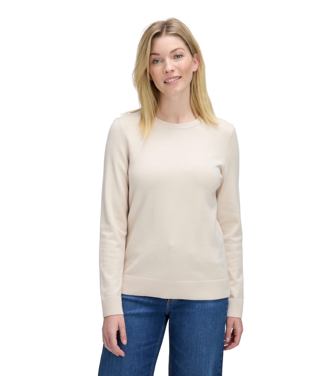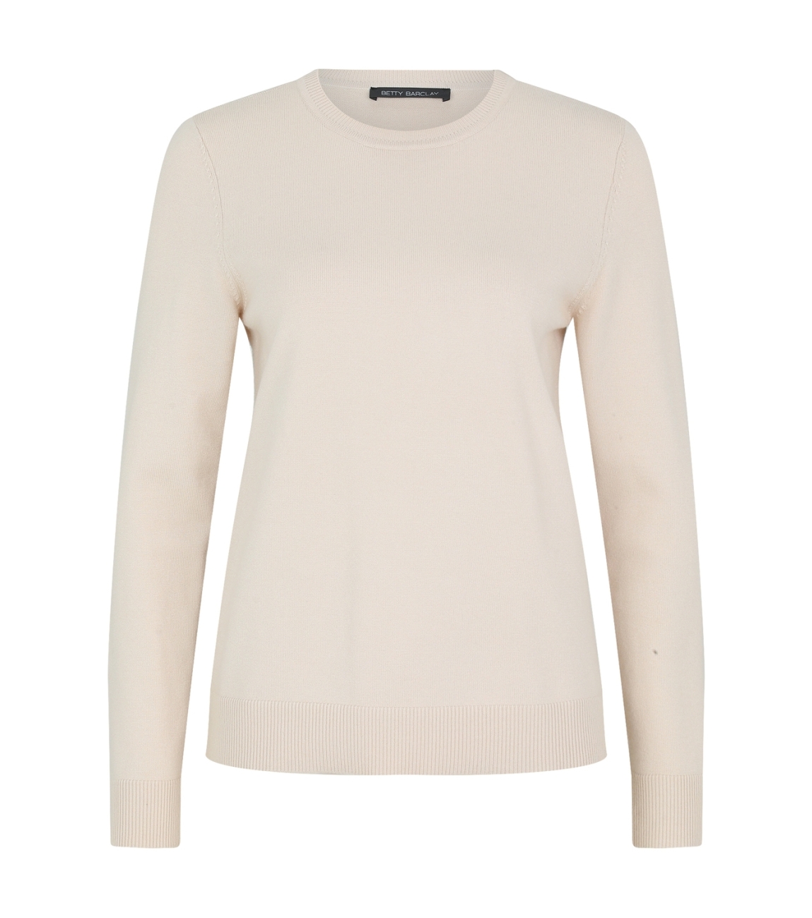 Betty Barclay pullover 53422907 9104. Dit rechtvallende model heeft een ronde halslijn en lange mouwen. Deze beige pullover van Betty Barclay is afgewerkt met ribgebreide boorden en is uitgevoerd in stretchkwaliteit.