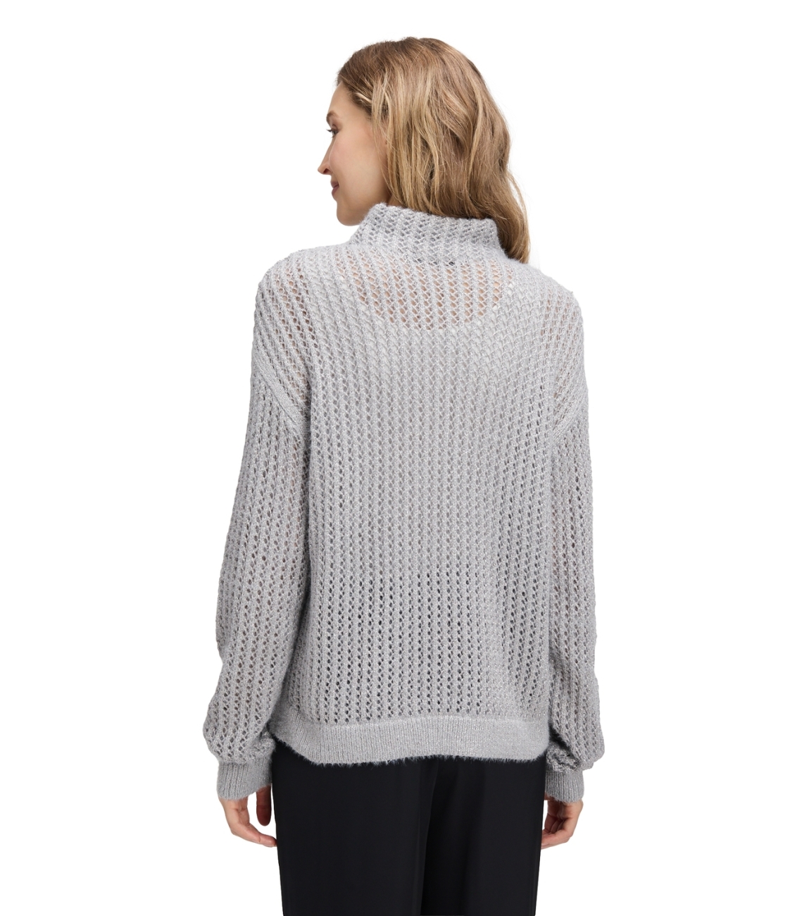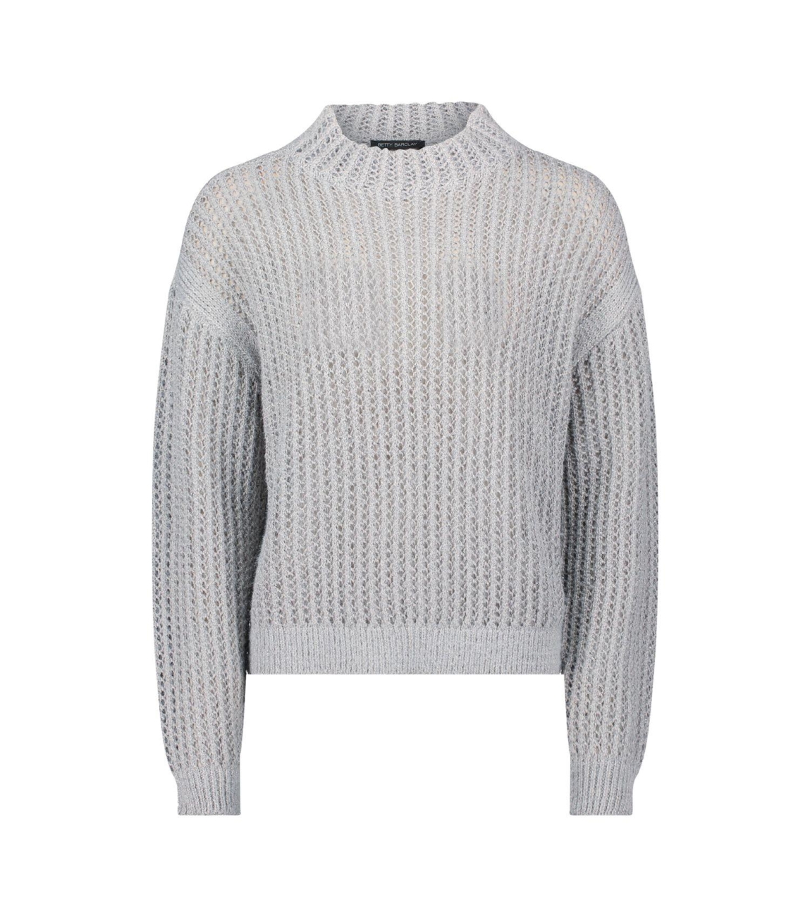 Betty Barclay Strickpullover Kurz 1/1 Arm 9125 Cloud grey. Dit rechtvallende model heeft een opstaande kraag en lange mouwen. Deze grijze pullover van Betty Barclay is uitgevoerd in een opengehaakte kwaliteit. Dit model is bewerkt met een subtiele glitter.