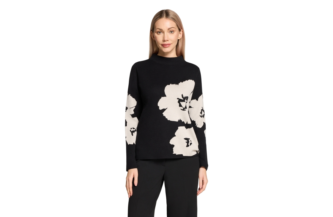 Betty Barclay Strickpullover Kurz 1/1 Arm 9911 Patch black/cream. Dit rechtvallende model is voorzien van een opstaande kraag en heeft lange mouwen. Deze zwarte pullover van Betty Barclay is bewerkt met sierlijke bloemen op de voorzijde en is afgewerkt met ribboorden.