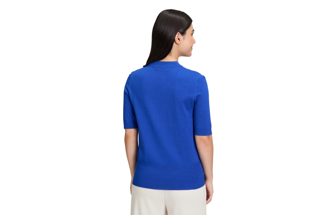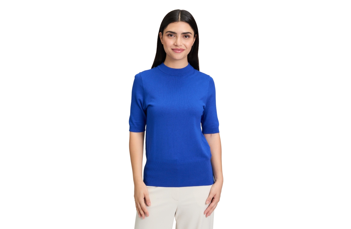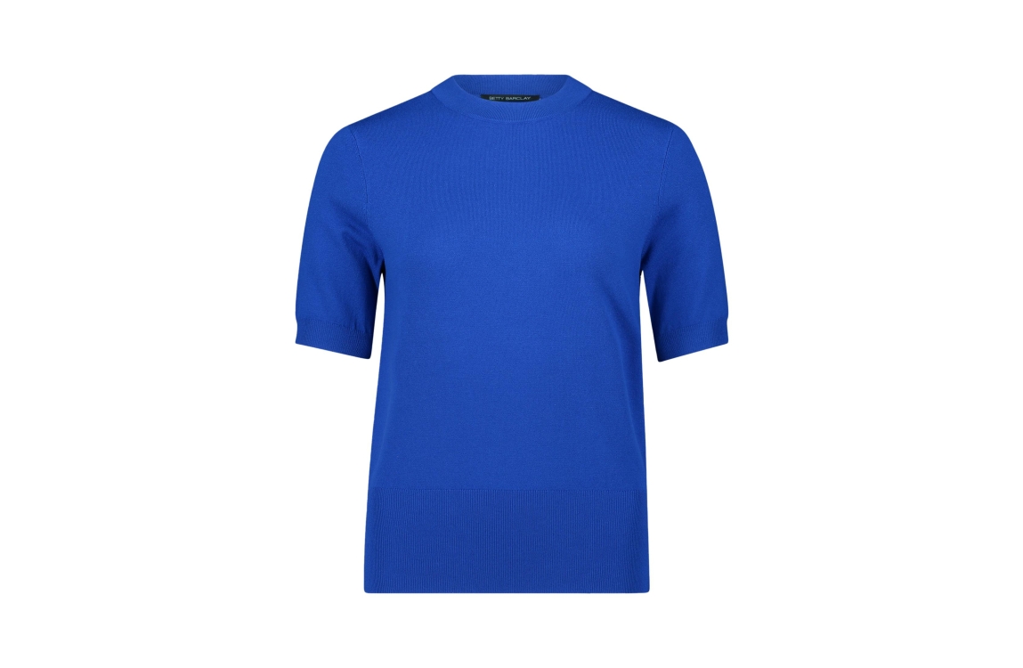 Betty Barclay pullover 5286/1440/8329. Dit rechtvallend model heeft een turtleneck en korte mouwen. Deze donkerblauwe pullover van Betty Barclay heeft ribgebreide boorden en is uitgevoerd in stretchkwaliteit.