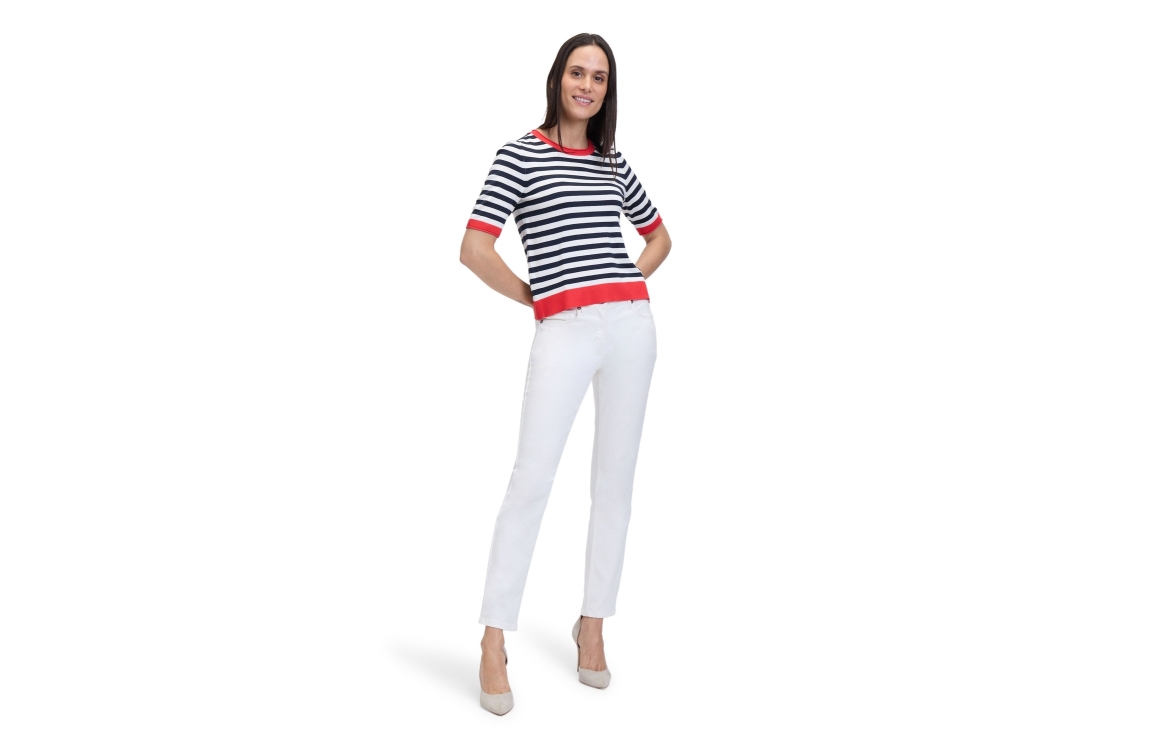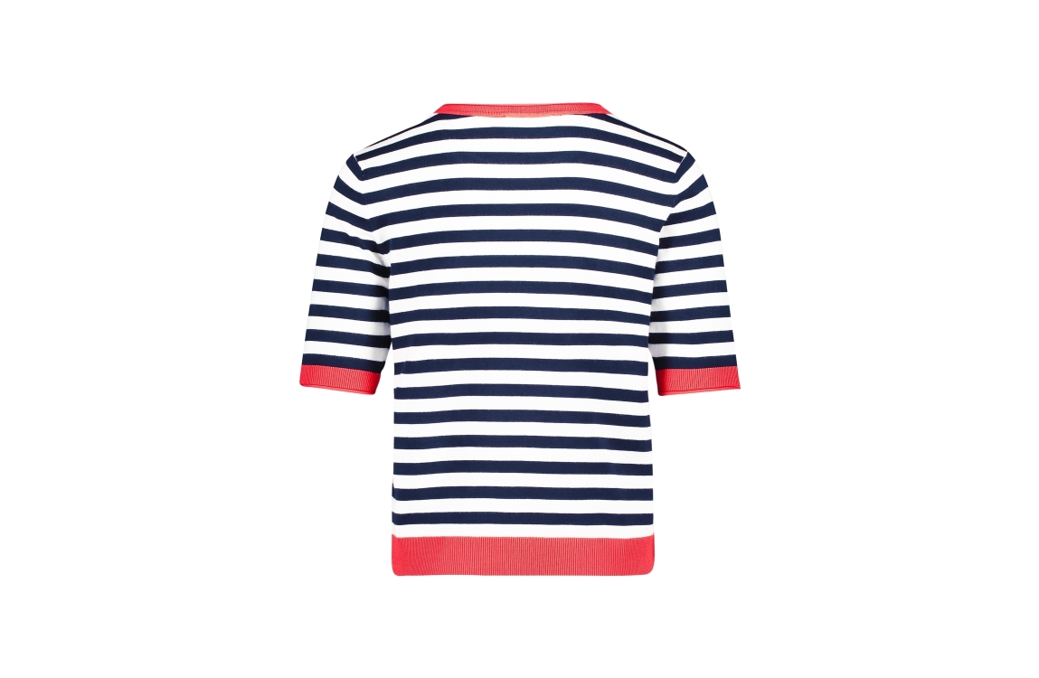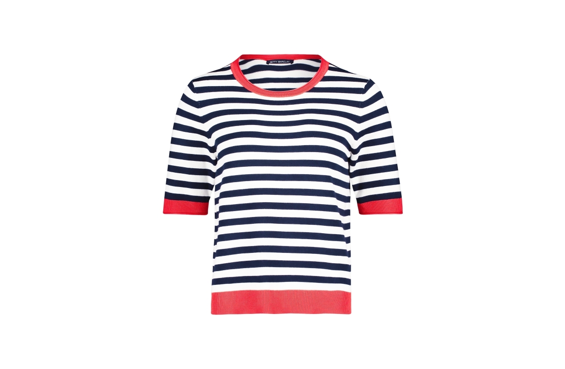 Betty Barclay top 5230/1036/8943. Dit aangesloten model heeft een ronde hals en korte mouwen. Deze gestreepte trui van Betty Barclay is voorzien van rode en navy strepen.