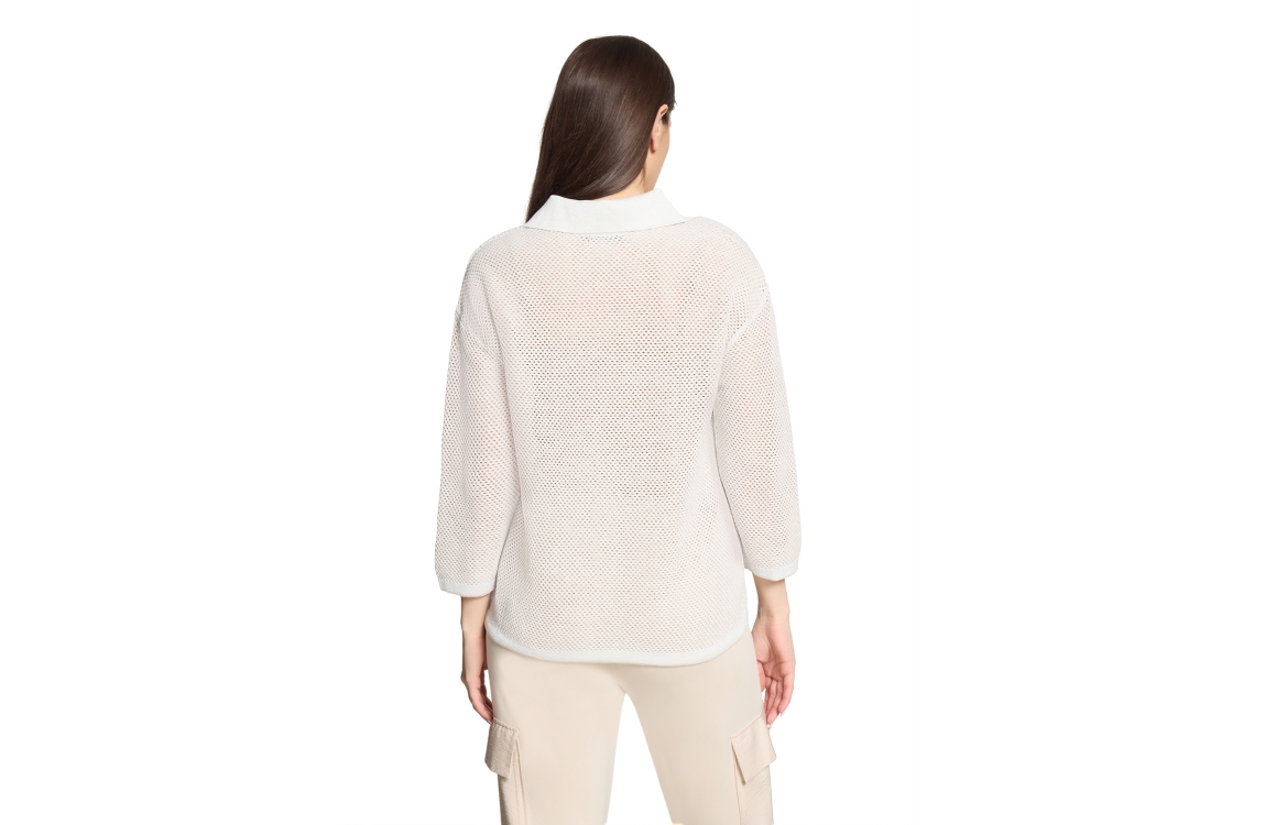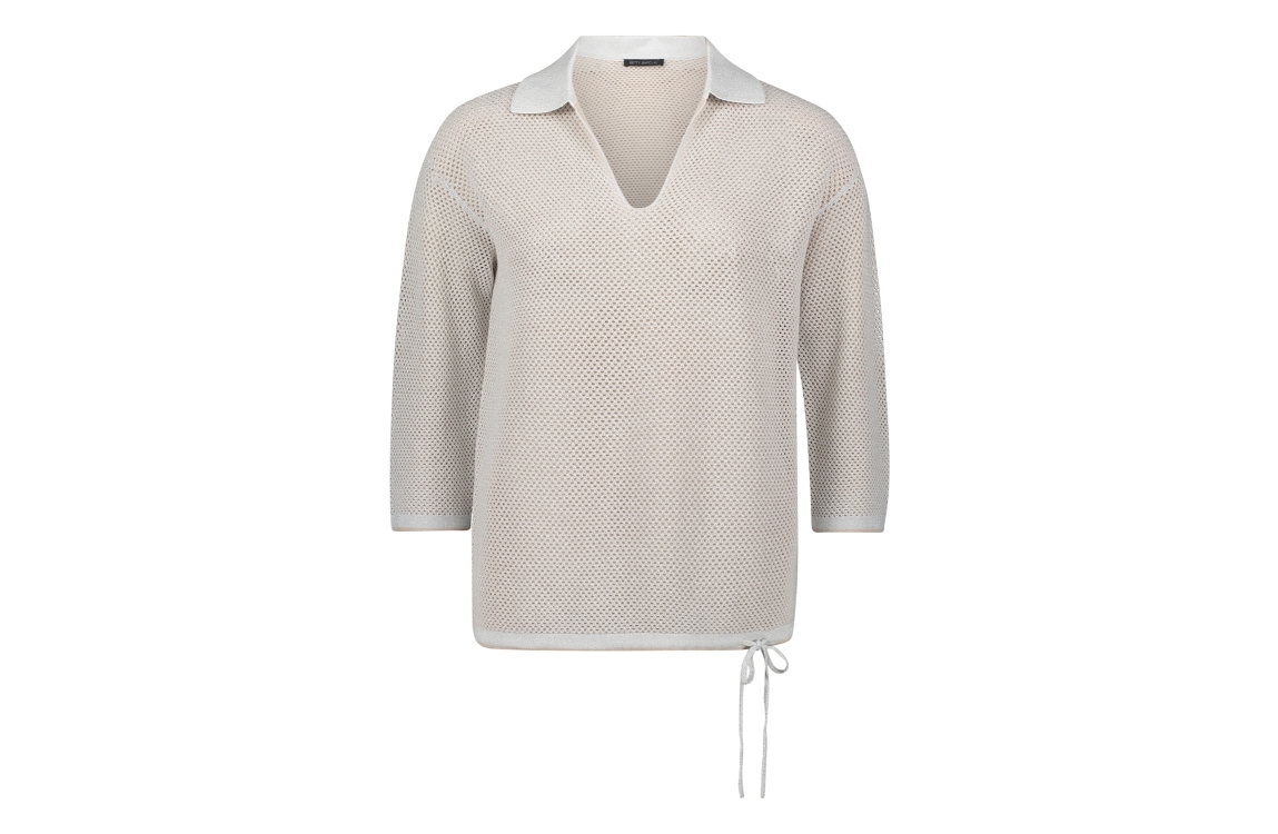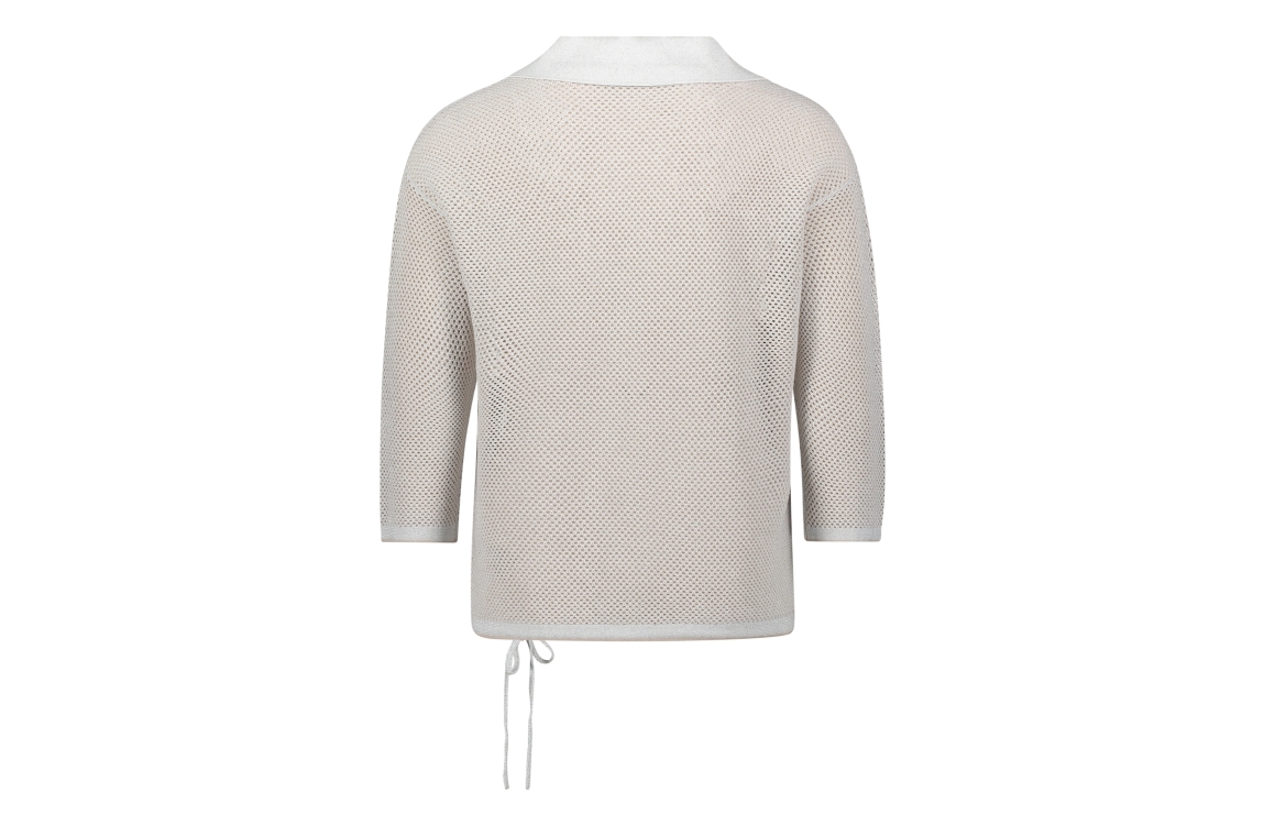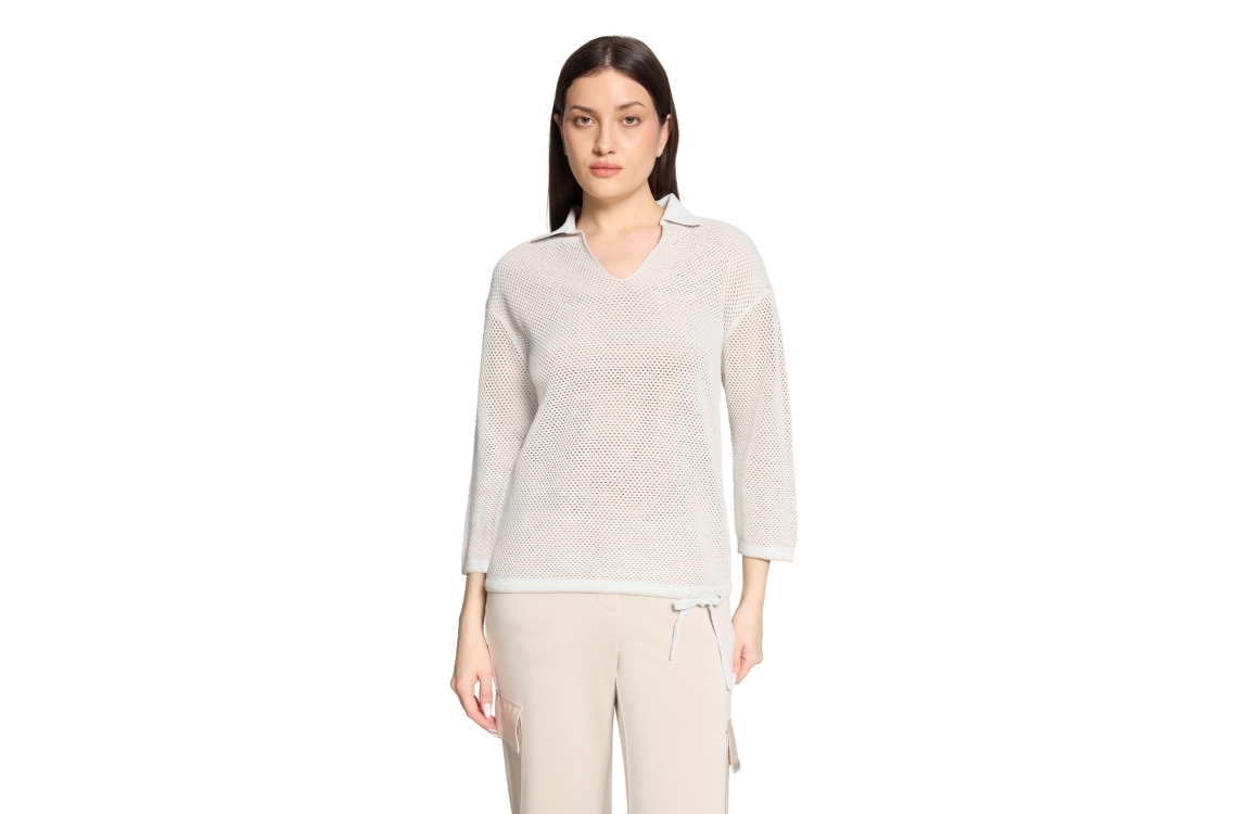Betty Barclay pullover 54141824. Dit soepelvallende model is voorzien van een kraag afgewerkt met een V-inkeping en heeft 7/8 mouwen. Deze beige kleurige pullover van Betty Barclay is uitgevoerd in een geperforeerde glitterstof en is aan de onderzijde voorzien van een trekkoord.