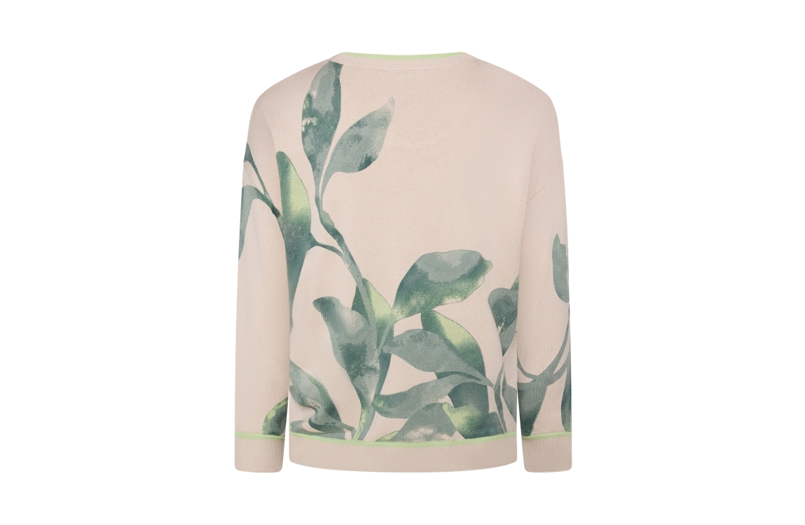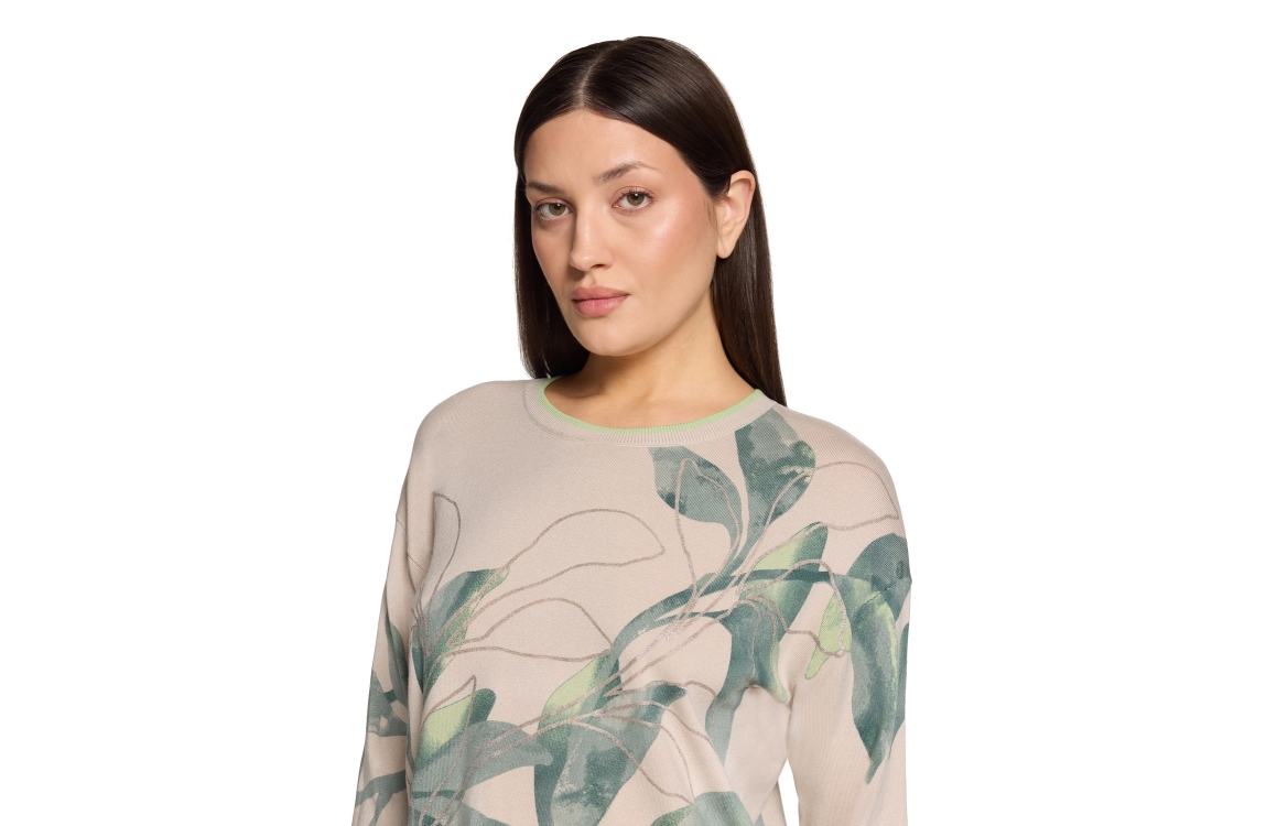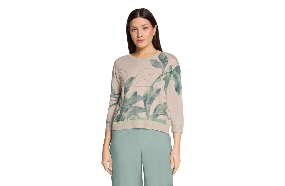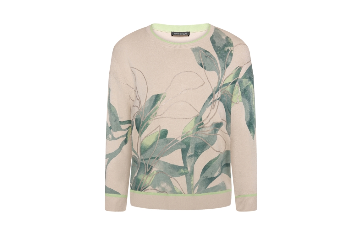 Betty Barclay pullover 54121809. Dit wijdvallende model is voorzien van een ronde hals en heeft 7/8 mouwen. Deze beige/groene pullover van Betty Barclay is bewerkt met een bladeren print. Dit model is afgewerkt met ribgebreide boorden.