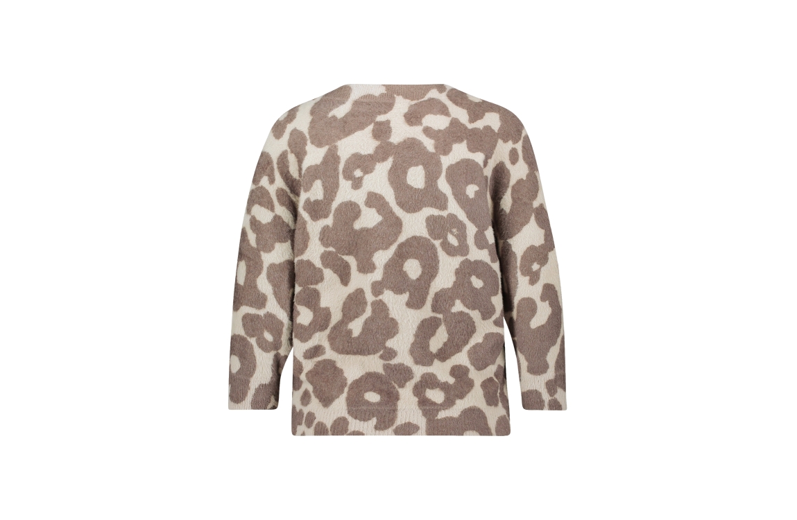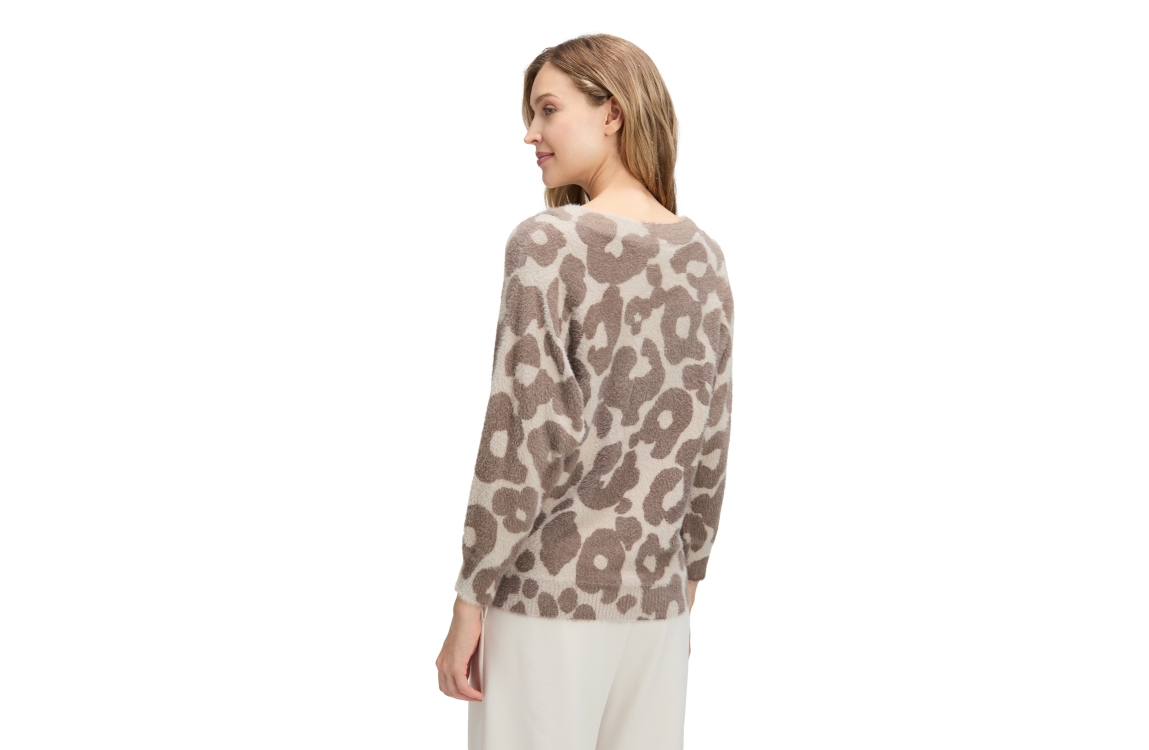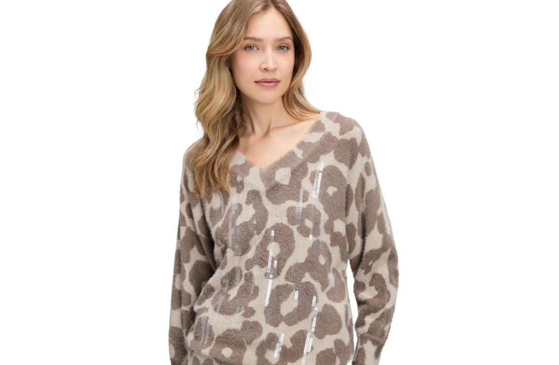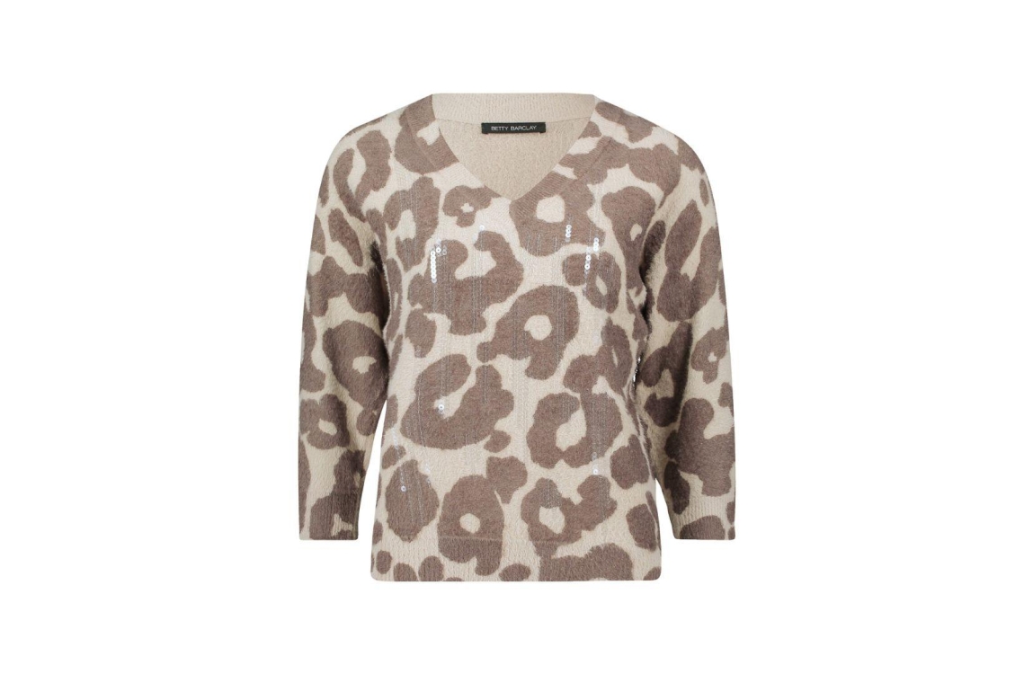 Betty Barclay pullover 53281605 7876. Dit rechtvallende model heeft een V-halslijn en lange mouwen. Deze taupekleurige pullover van Betty Barclay is all-over bewerkt met een panterprint in verschillende tinten en is gedetailleerd met doorzichtige pailletten. Het model is afgewerkt met ribgebreide boorden.