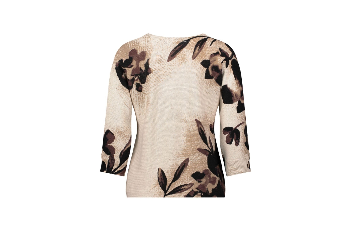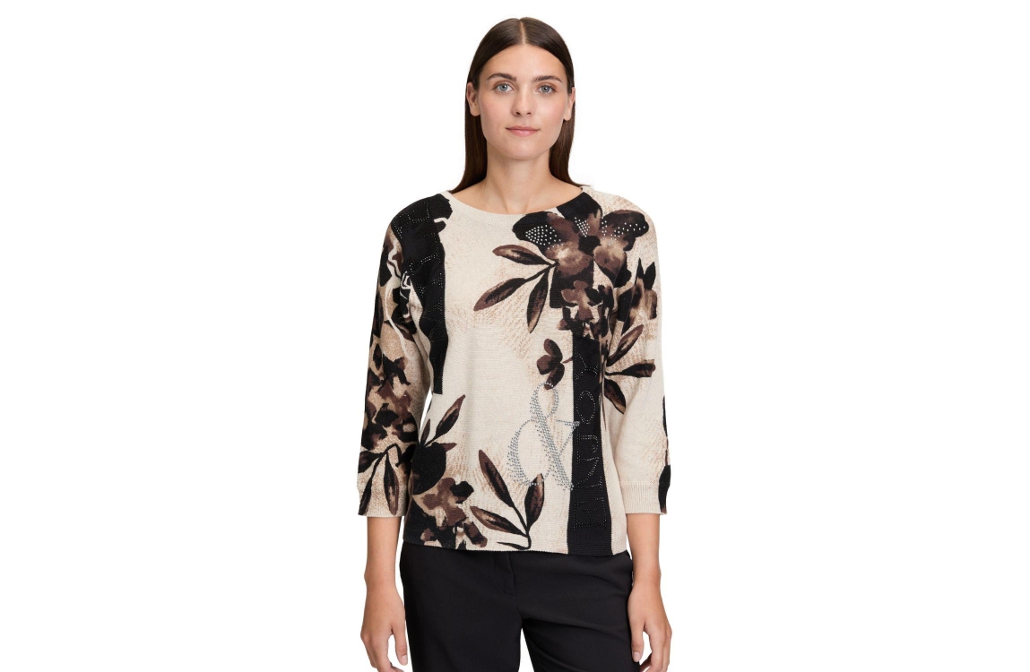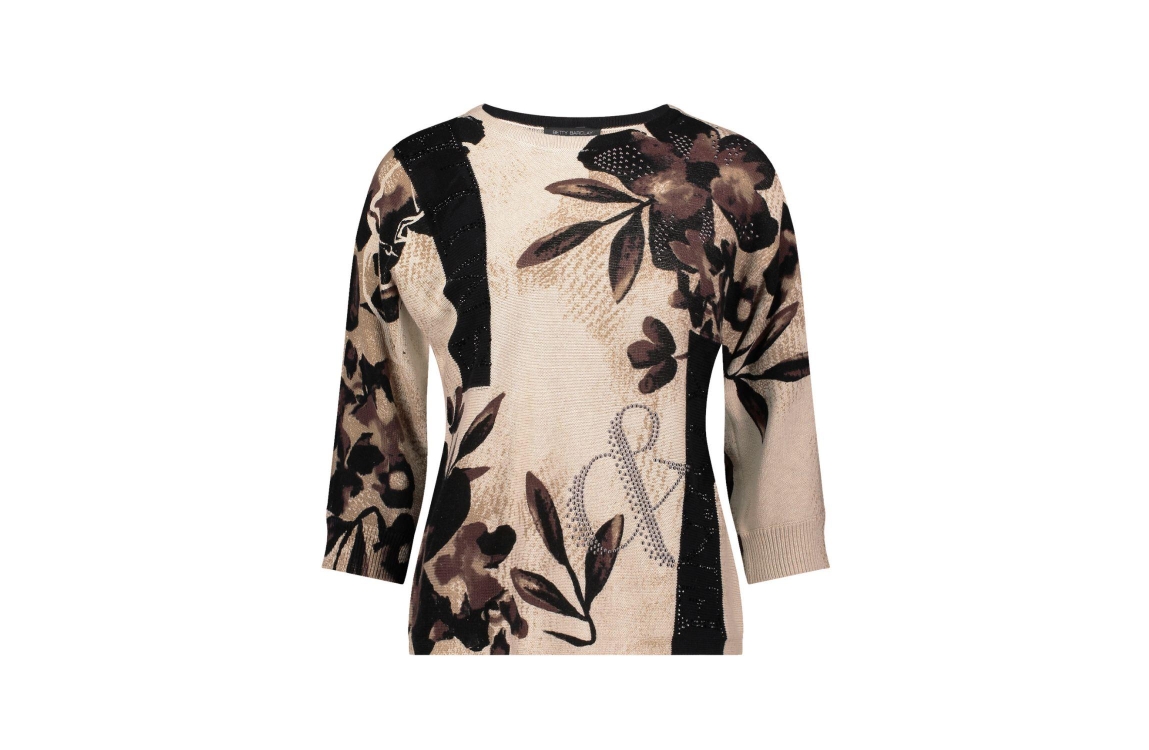 Betty Barclay Strickpullover Kurz 3/4 Arm 7875 Beige/brown. Dit rechtvallende model heeft een ronde hals en driekwart mouwen. Deze beige pullover van Betty Barclay is all-over bewerkt met een bloemenprint in verschillende kleuren en is bewerkt met steentjes.