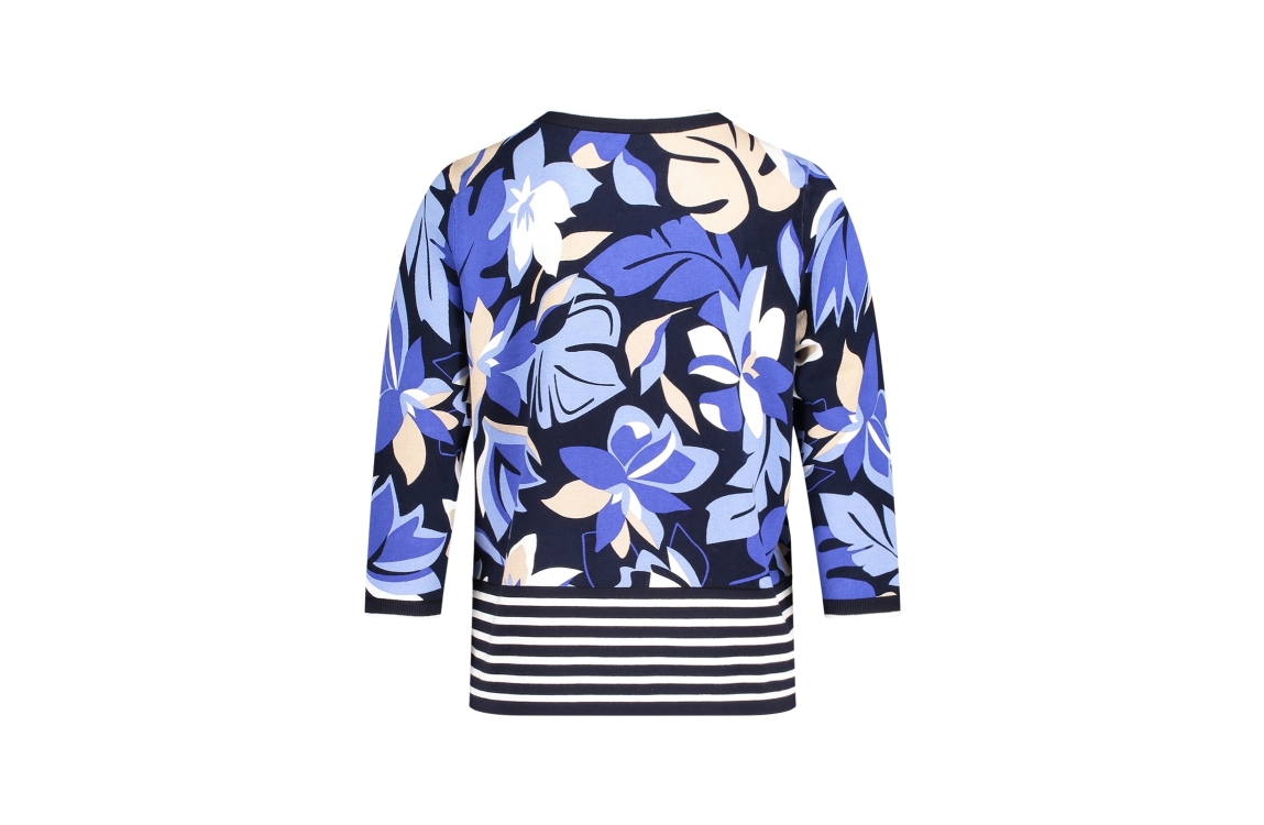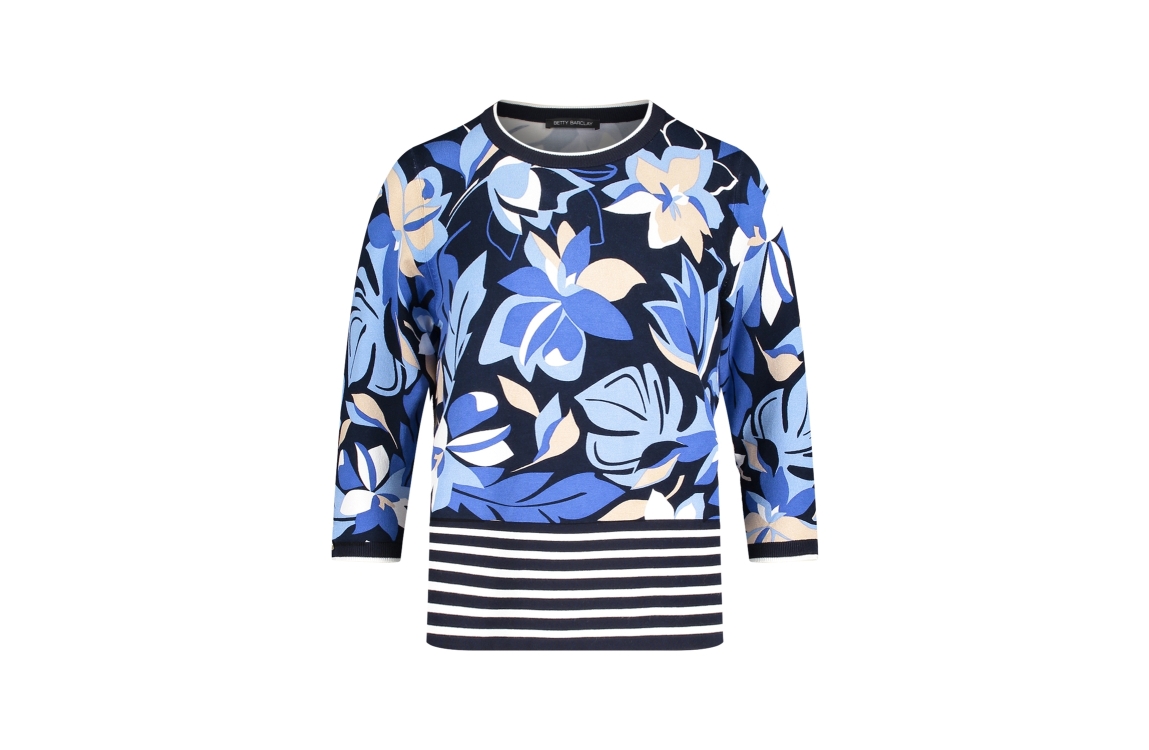 Betty Barclay shirt 54001727. Dit rechtvallend model is voorzien van een ronde hals en heeft driekwart mouwen. Deze blauwe shirt van Betty Braclay is bewerkt met een blad- en streepprint.