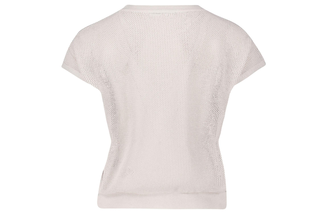 Betty Barclay pullover 5268/1405/5713. Dit wijdvallend model heeft een ronde hals en korte mouwen. Deze zandkleurige pullover van Betty Barclay is uitgevoerd in een opengehaakt breisel en is afgewerkt met ribgebreide boorden.